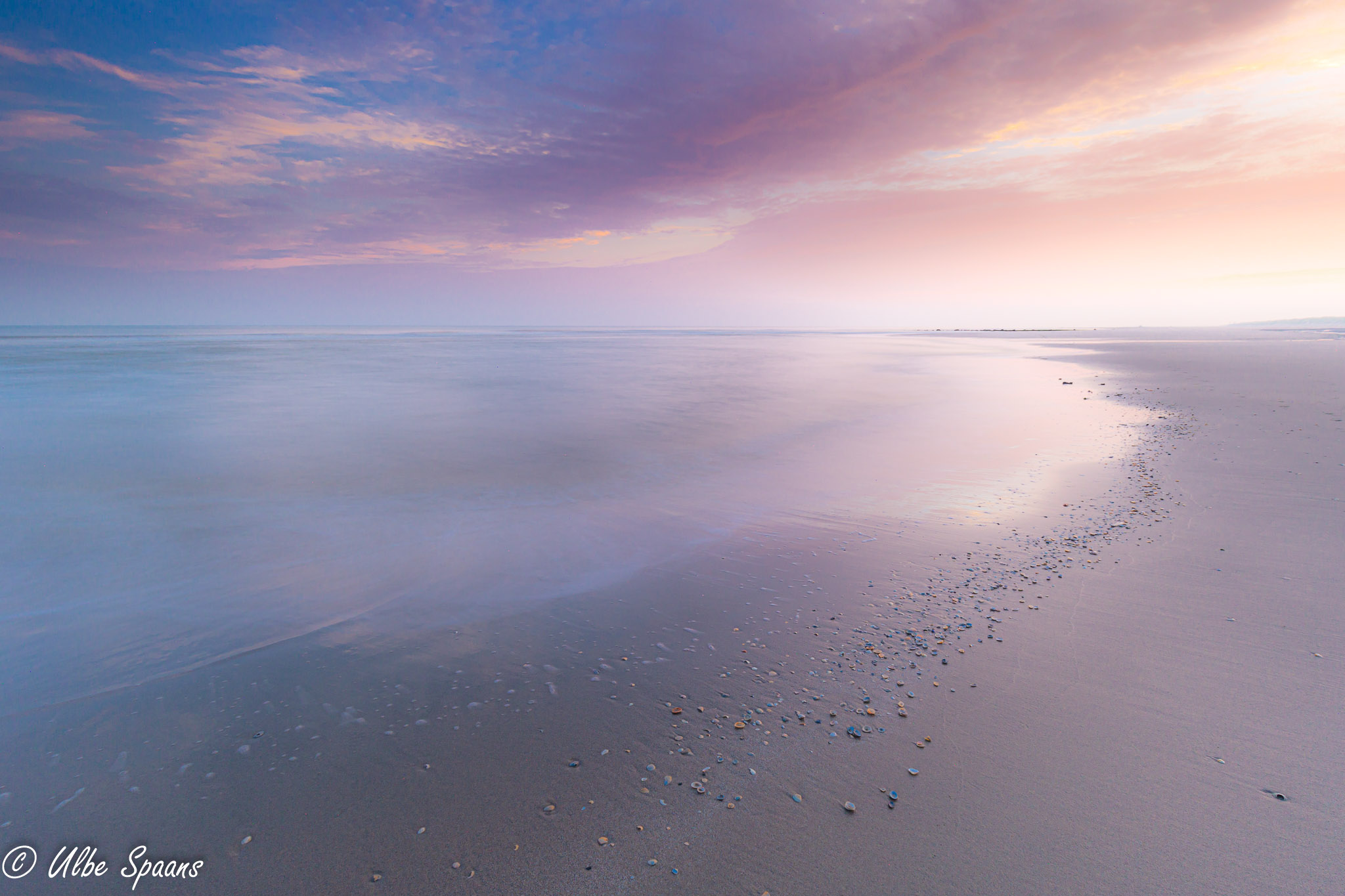 Lange sluitertijd-opname van schelpen langs de vloedlijn.