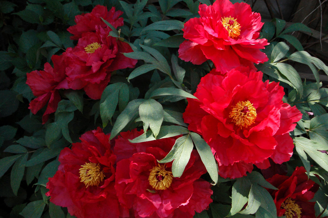 Onze pioenrozen in het 3e jaar na aanplanten vol in bloei. Na een kleine reeks van opnamen uit diverse hoeken had ik mede door de mooie lichtval opeens dit schilderachtige beeld.