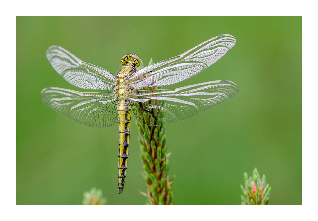 Closeup van een Orthetrum cancellatum oftewel de Oeverlibel. Door de lichtinval van achteren te gebruiken kreeg ik deze prachtige schittering op de vleugeltjes.