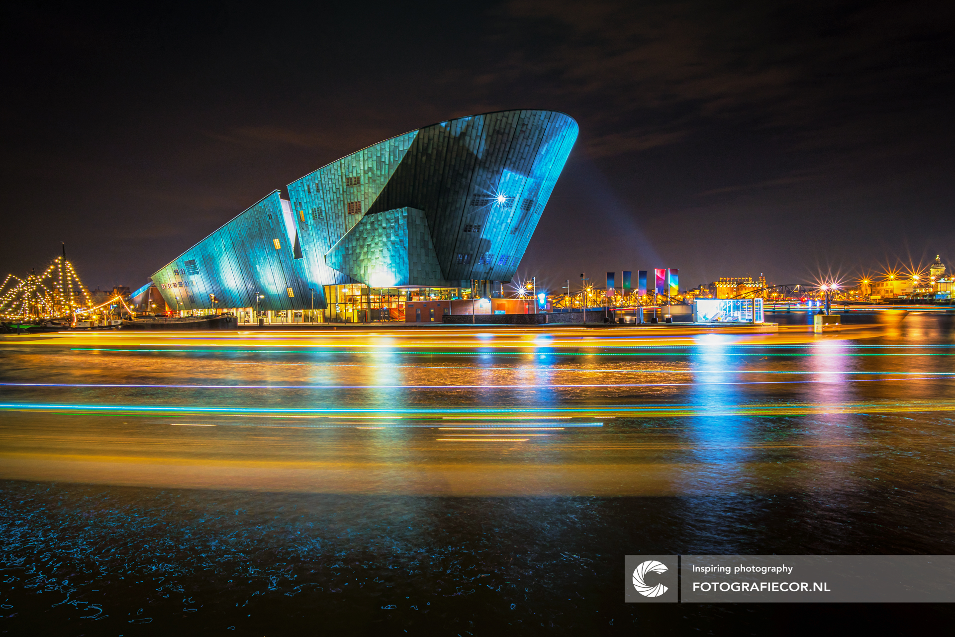 Avondfotografie bij het Oosterdok van Amsterdam. Ten hoogte van de IJ-tunnel staat dit bijzondere stukje architectuur. Het groenkoperen gebouw van het wetenschapsmuseum geeft een prachtig contrast met de omgeving. De Lichtstrepen op het water zijn de beroemde Amsterdamse kanaalboten die in de avond toeristen rondvaren voor het Amsterdam Light Festival.
