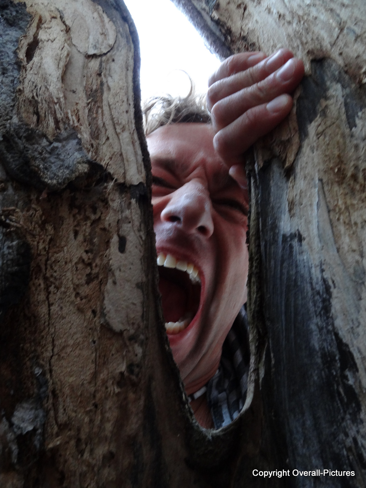 Ik heb zijn S..y pocketcamera gevraagd en ik heb mijn hand in de boom gedaan door een gat onderin de boom. Daarna de camera aan mezelf gegeven in de boom, mijn gezicht voor de grote scheur gehouden en een emotie aangebracht op mijn gezicht. Daarna KLIK!