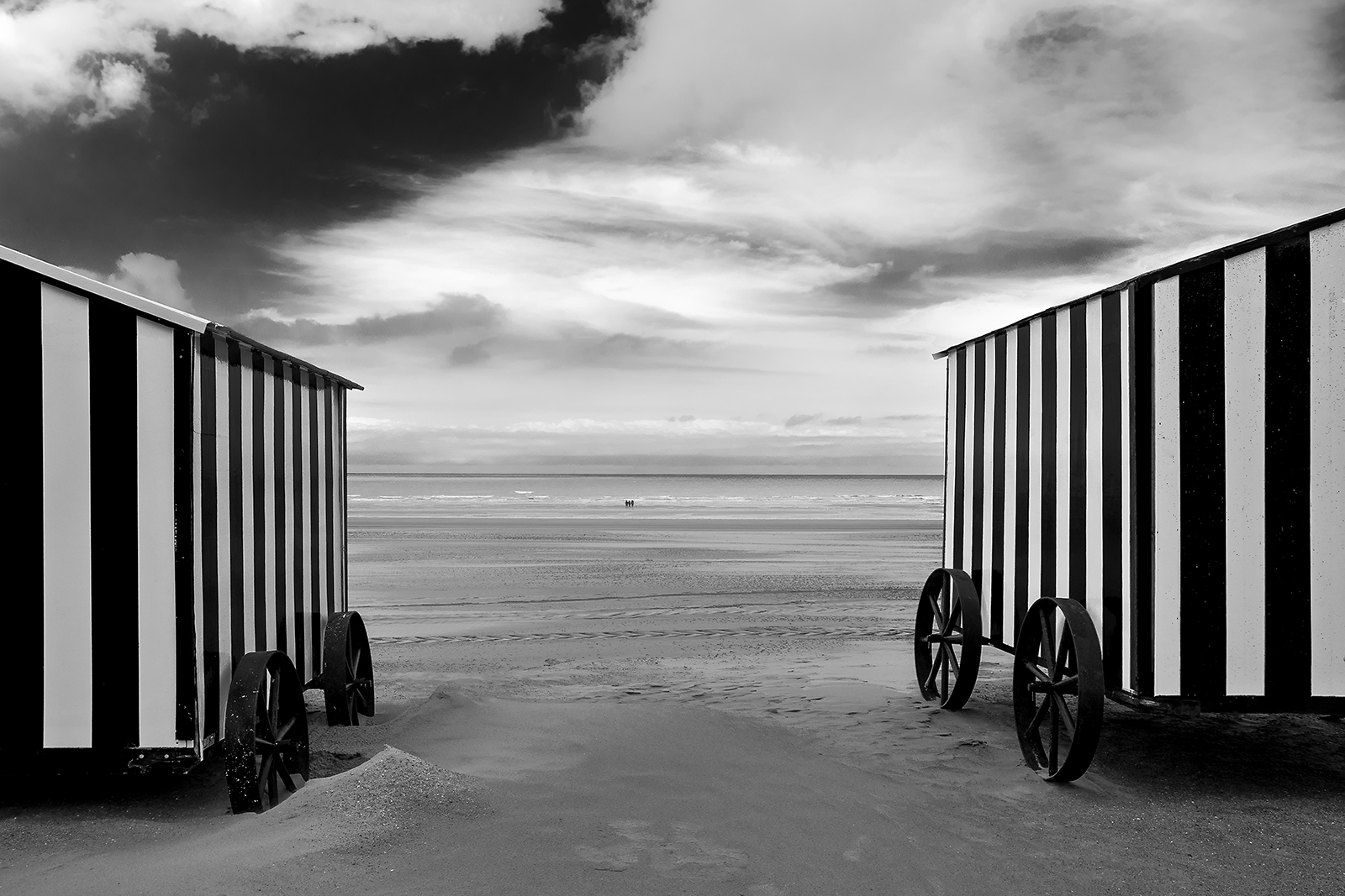 Wandelaars op het strand van De Panne, Vlaanderen, tijdens een frisse lentedag... Dit strand is vooral gekend voor de retro strandcabines...