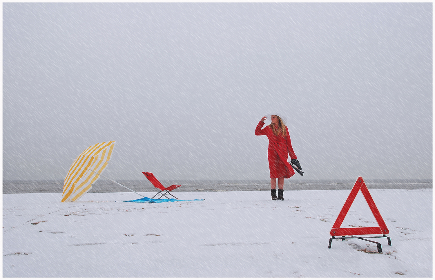 Ik heb deze foto gemaakt op het strand van Noordwijk met model Merel. Het was de de dag dat de dooi kwam, na alle speculaties over een eventuele elfstedentocht in Nederland. Ik wilde een afwijkend beeld neerzetten. Iemand die wacht op een seizoen, maar welke.......