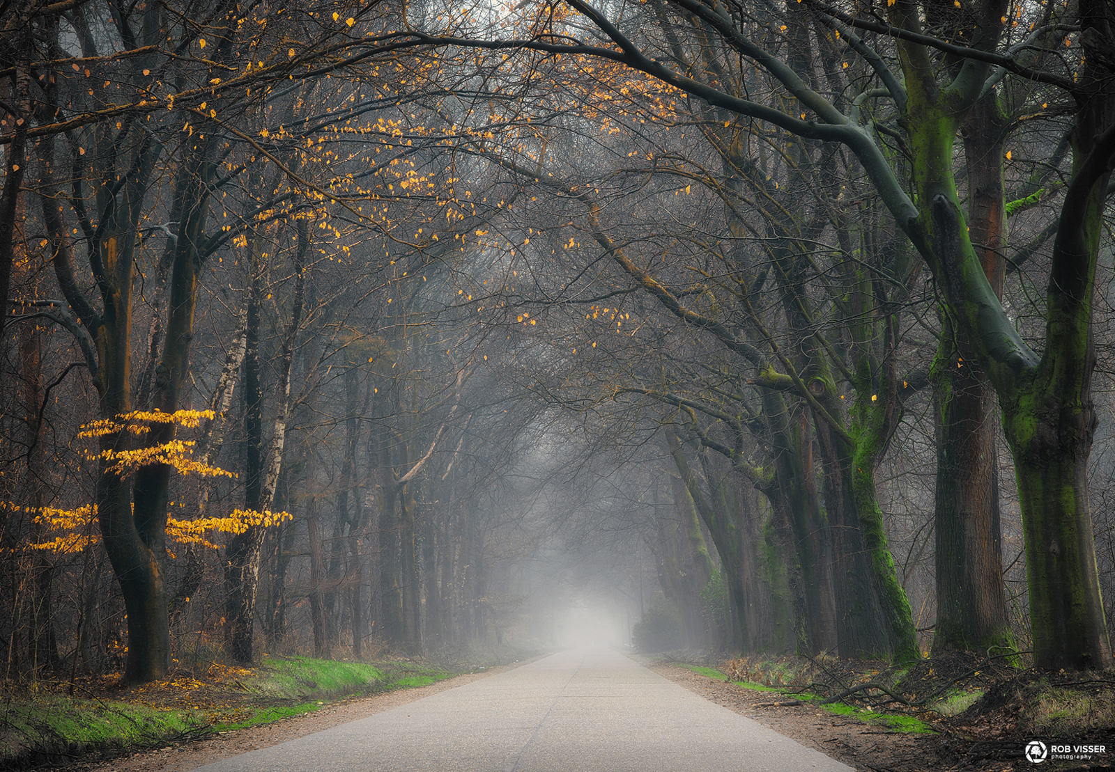 Een weg door herfstachtige bomen in het begin van de lente in Goirle.