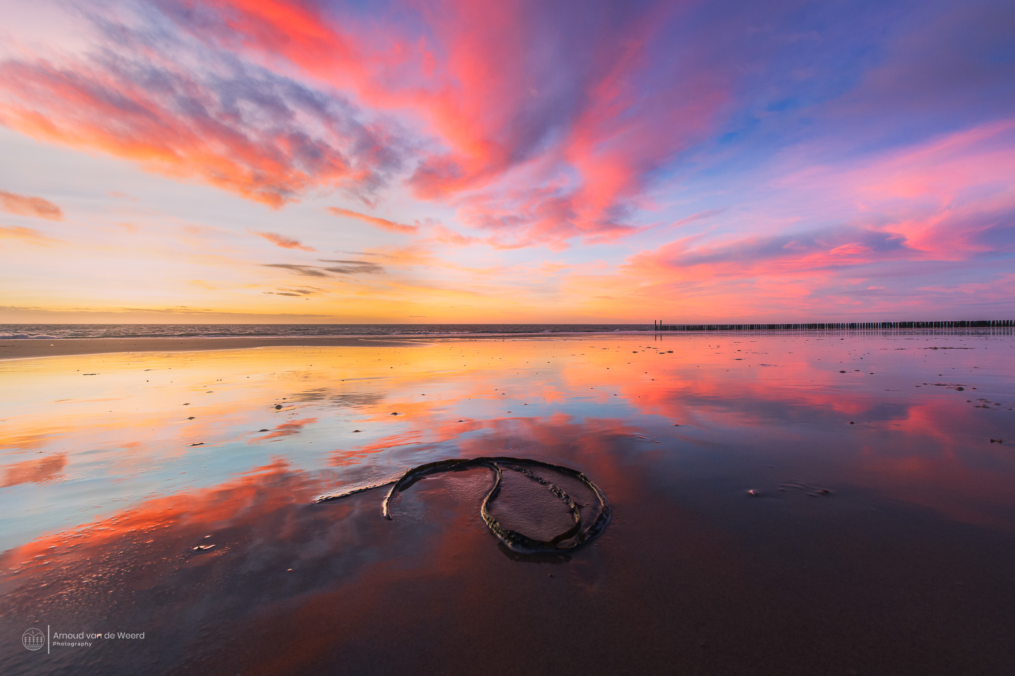Vlak voor kerst waren er mooie kleuren op het strand in Zeeland. Het stukje zeewier werkte als mooie blikvanger in de voorgrond.