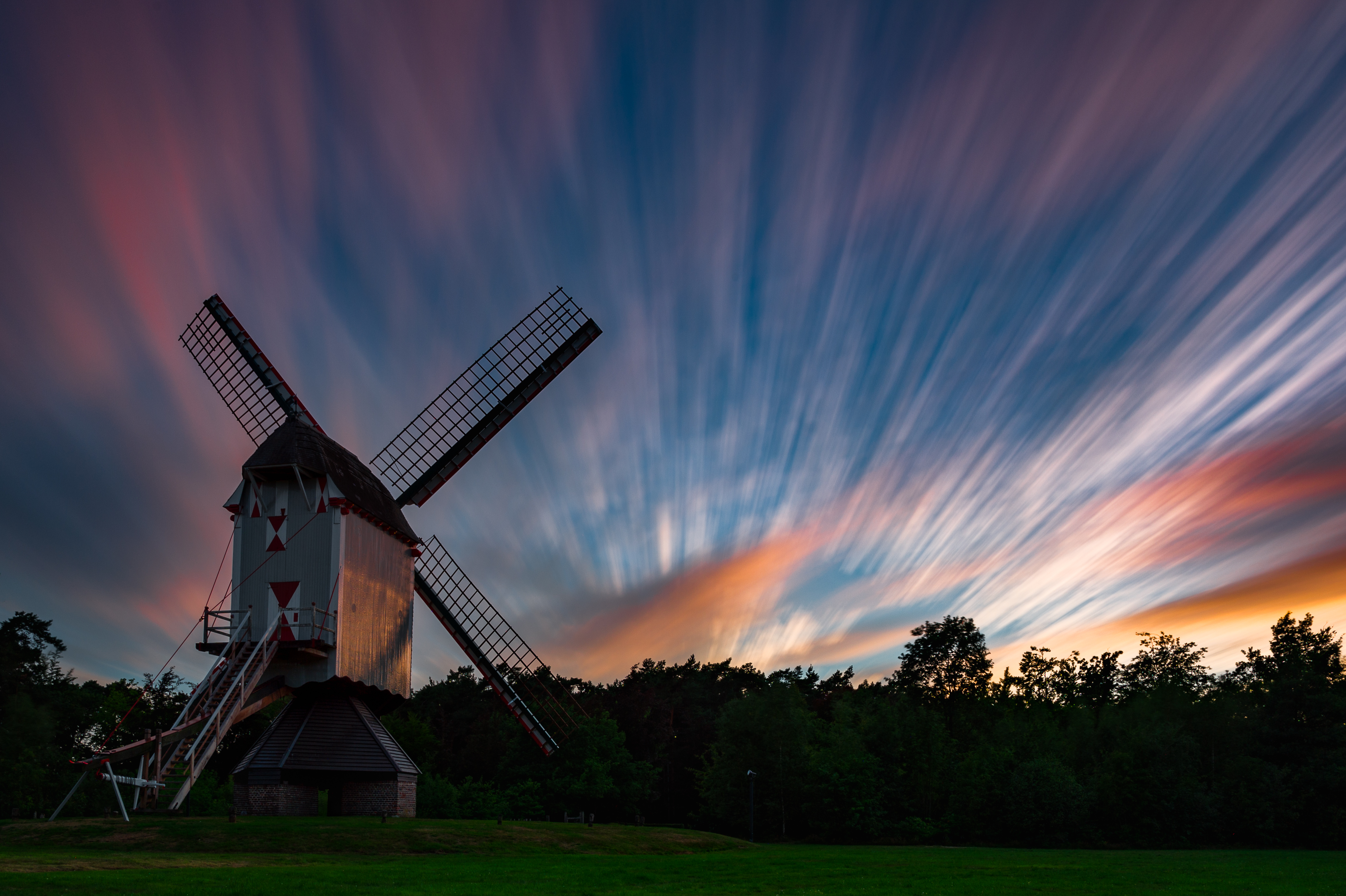 Een lange belichting van de Sevensmolen (Overpelt) tijdens een ondergaande zon.