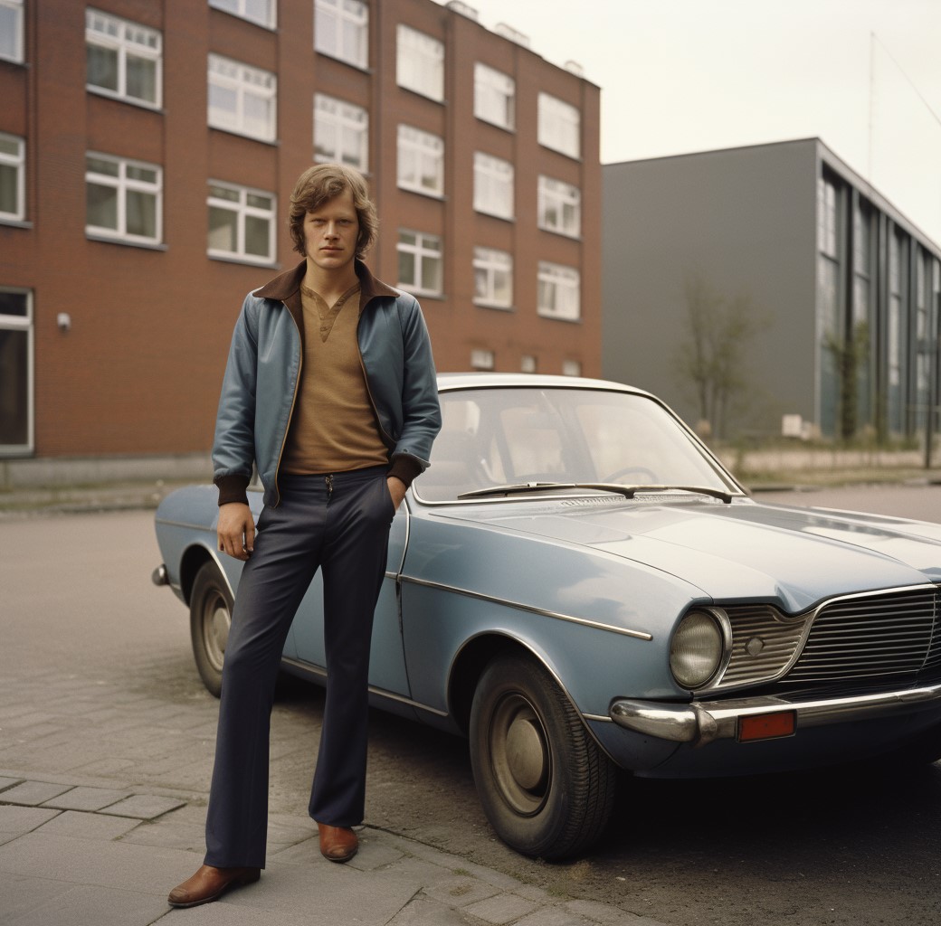Christian poseert bij zijn auto, zeventiger jaren