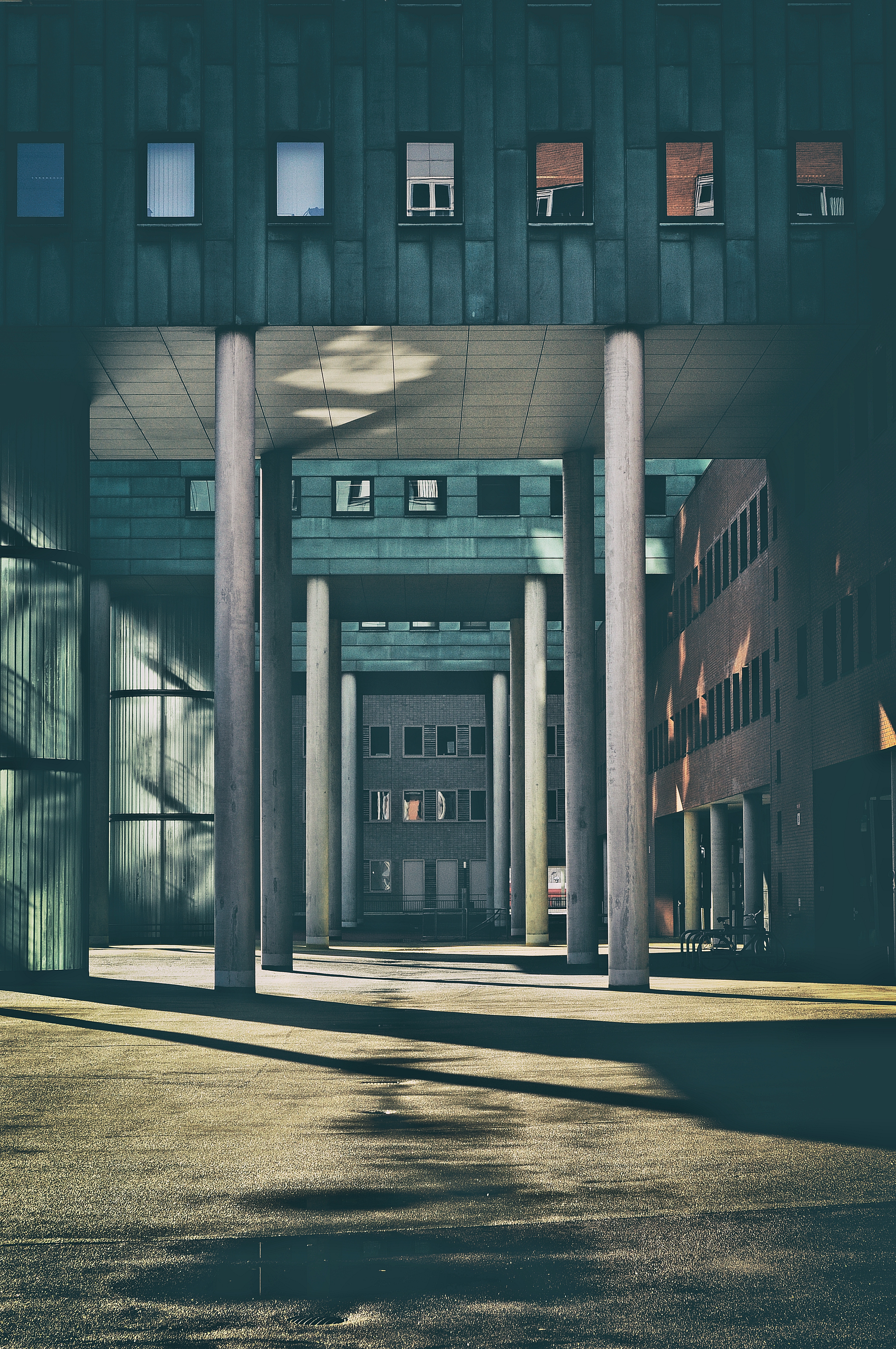 Mooi gebouw naast het hoofdstation in Groningen.Een trappenhuis aan de linkerkant van doorzichtig materiaal en hoge pilaren ter ondersteuning van de midden stukken geeft een mooi schaduweffect.