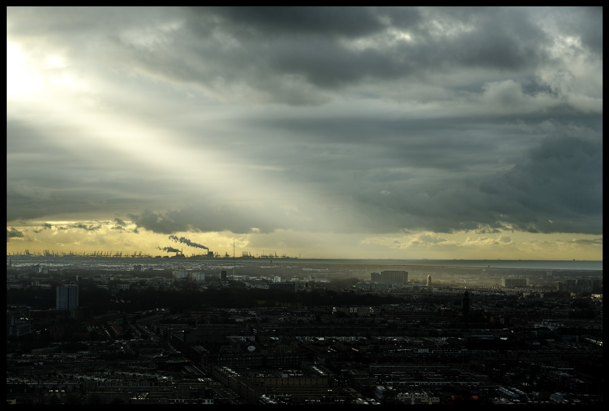 View vanaf de 42e verdieping van "De Strijkijzer" vlak bij station Holland Spoor Den Haag. Je kijkt richting Hoek van Holland met een beam of light op het Haga Ziekenhuis