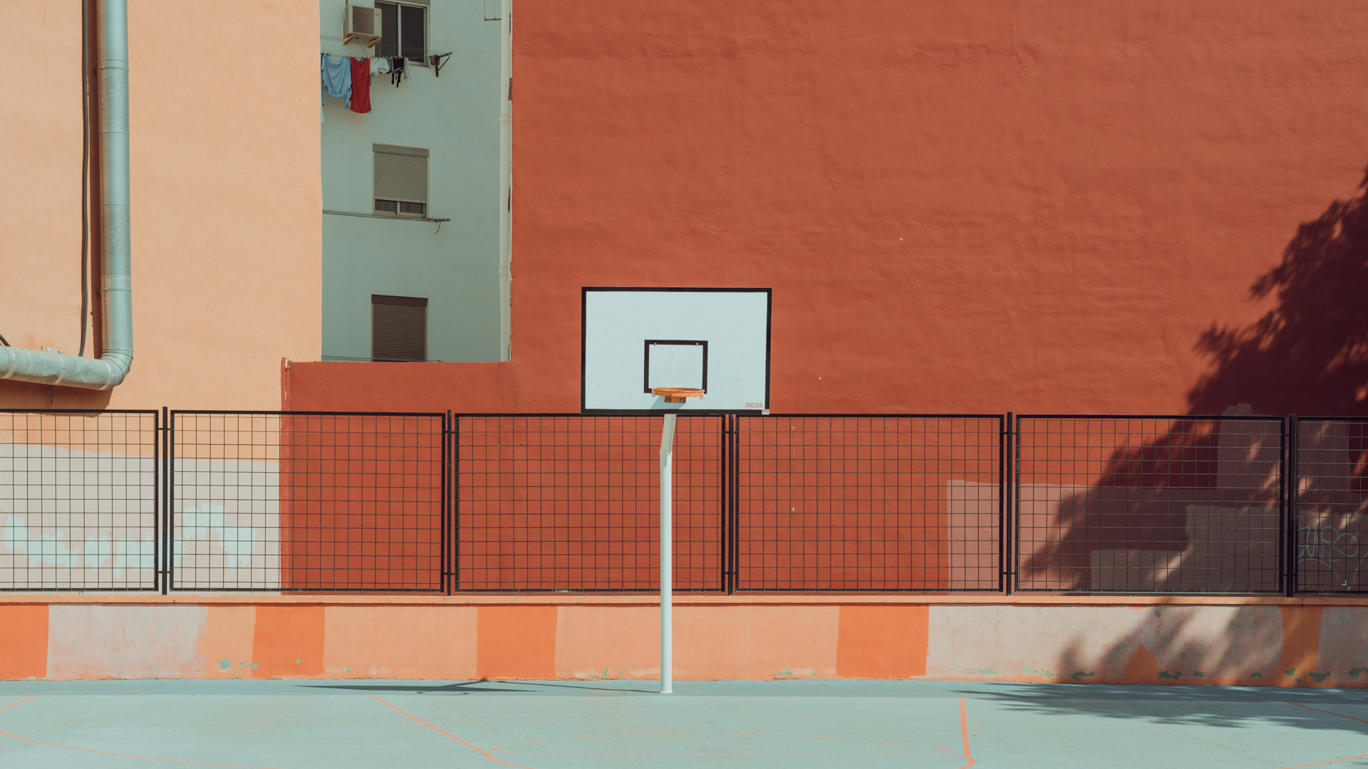 Basketbal veld in Valencia. Door het perspectief is bijna alle diepte in de foto verdwenen.