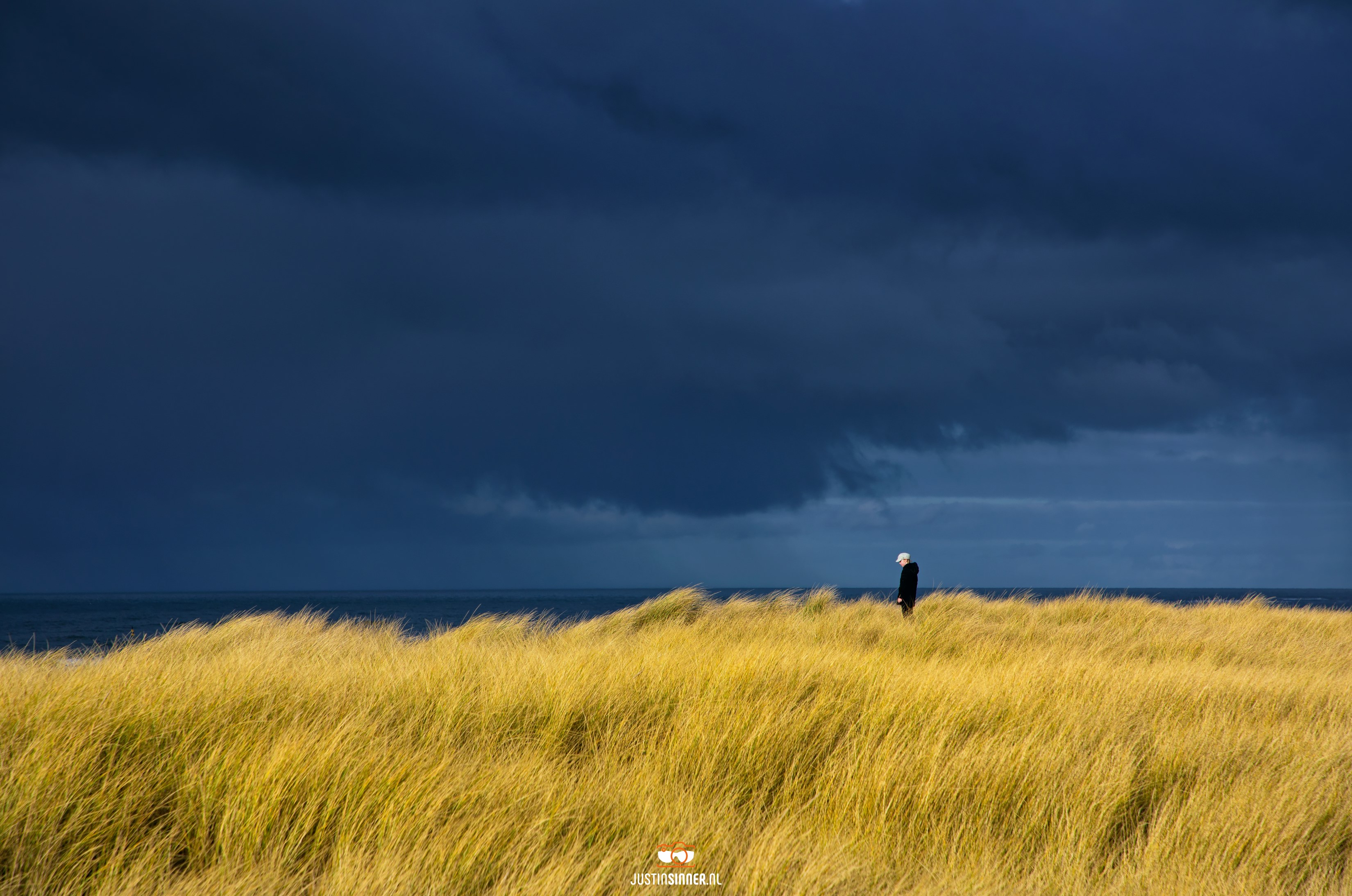 Donkere wolken boven de Noordzee, de laatste zonnestralen schijnen over het gele helmgras en het meisje dat net als ik staat te kijken naar de aanstormende buien. #texel #justinsinner #fotografie #waddeneiland #canonnederland