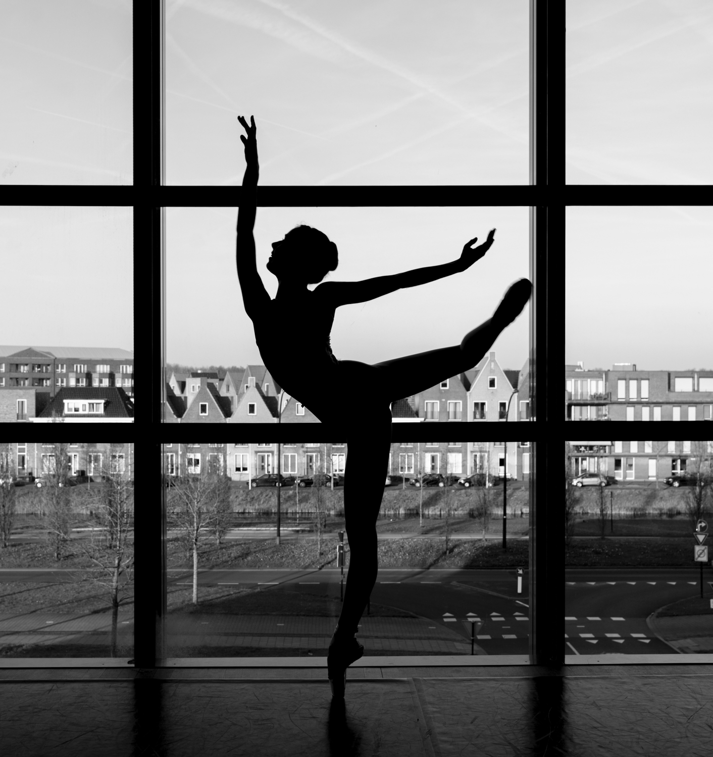 Dit silhouet heb ik gemaakt voor het raam met het daglicht als lichtbron en de straat als achtergrond. hiermee de meting op de ballerina gesteld en deze omgezet in zwart-wit.