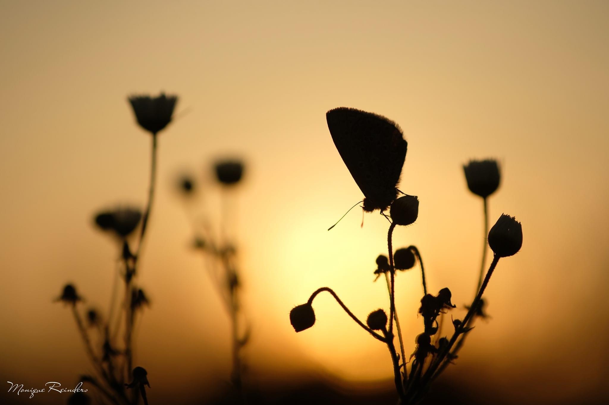 Een silhouette van een icarusblauwtje in het warme avondlicht.