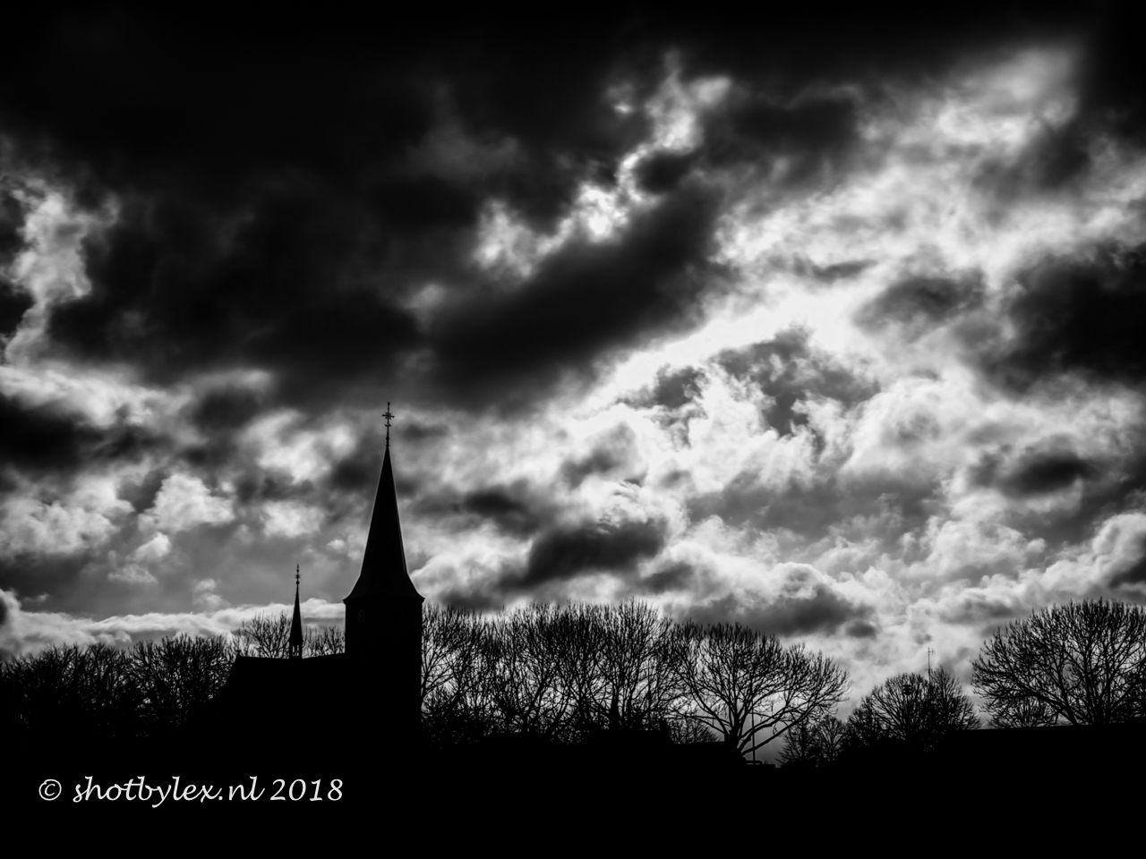 Silhouet van het kerkje dat bij de entree van het kleine dorpje Beers staat in Noord Brabant.