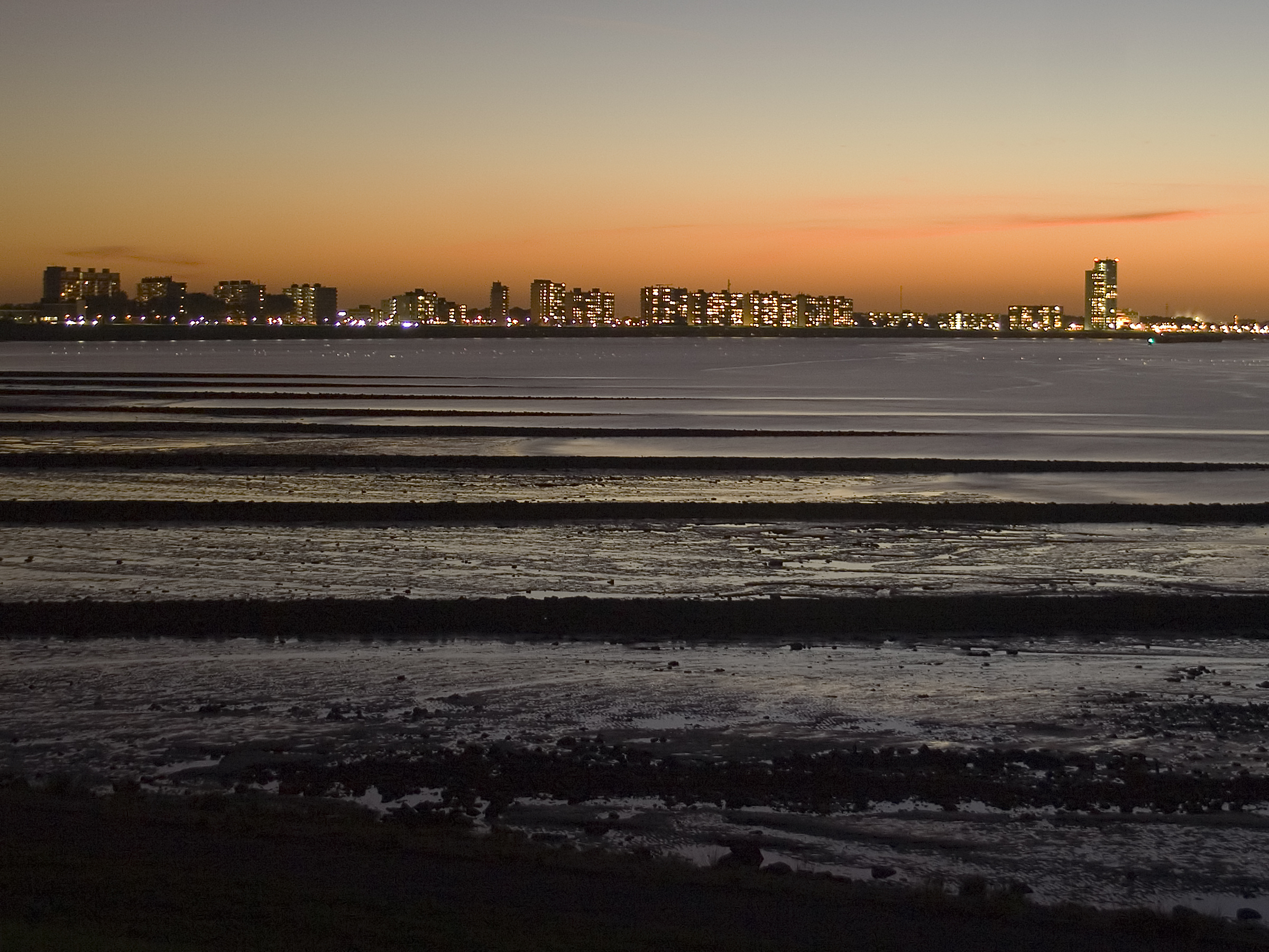 Een statief, een grijsverloopfilter, een vleugje van het laatste avondlicht en de binnenverlichting van een aantal bewoners. Op de voorgrond een deel van de door eb drooggevallen Westerschelde.