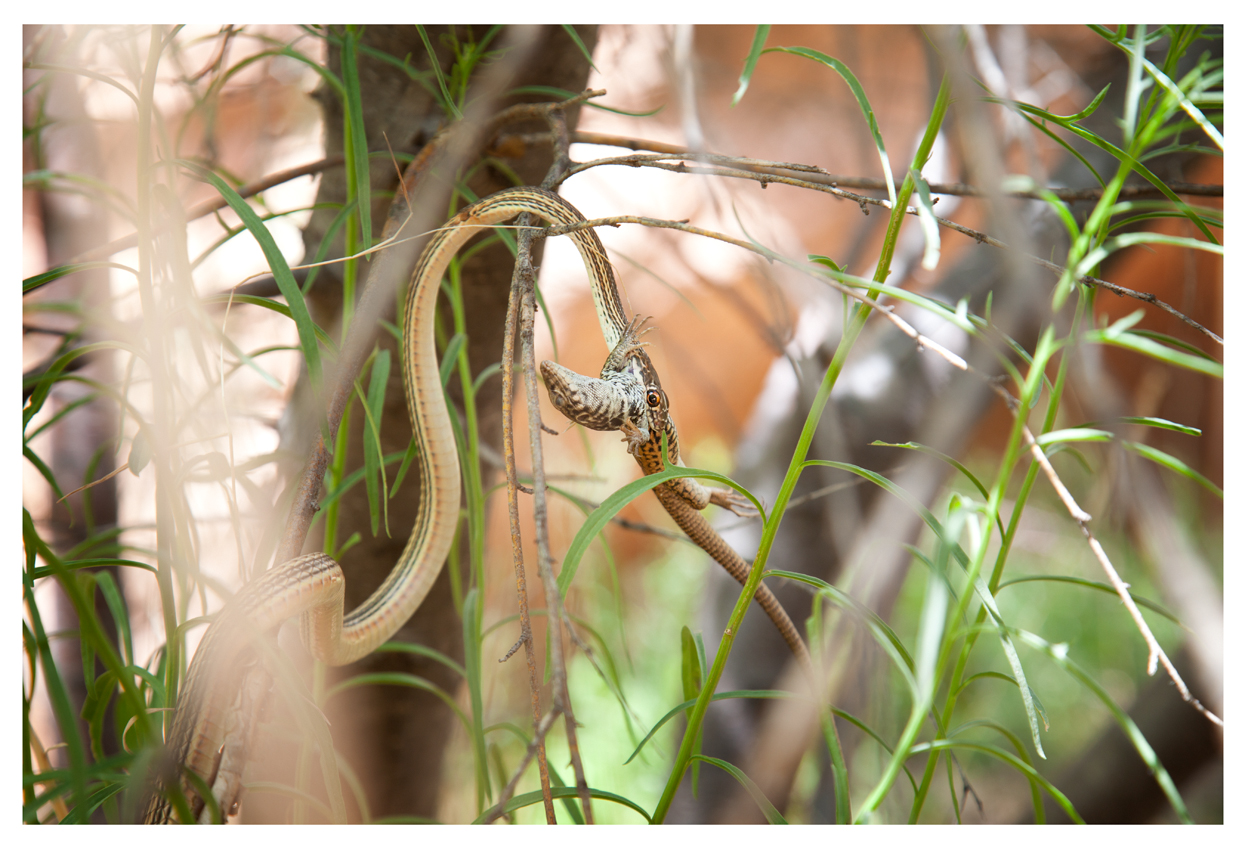 Een slang vangt een hagedis in Arches National Park in Amerika.