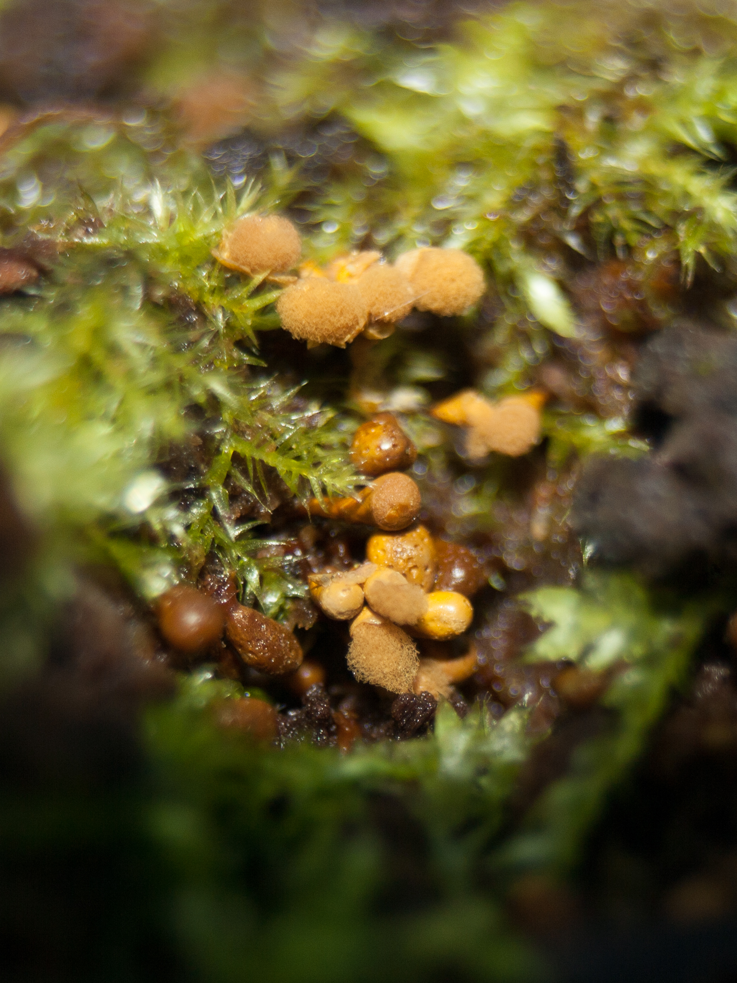 Macro van een groepje slijmzwammetje, vooral de superfijne structuur van de paddestoeltjes is mooi te zien