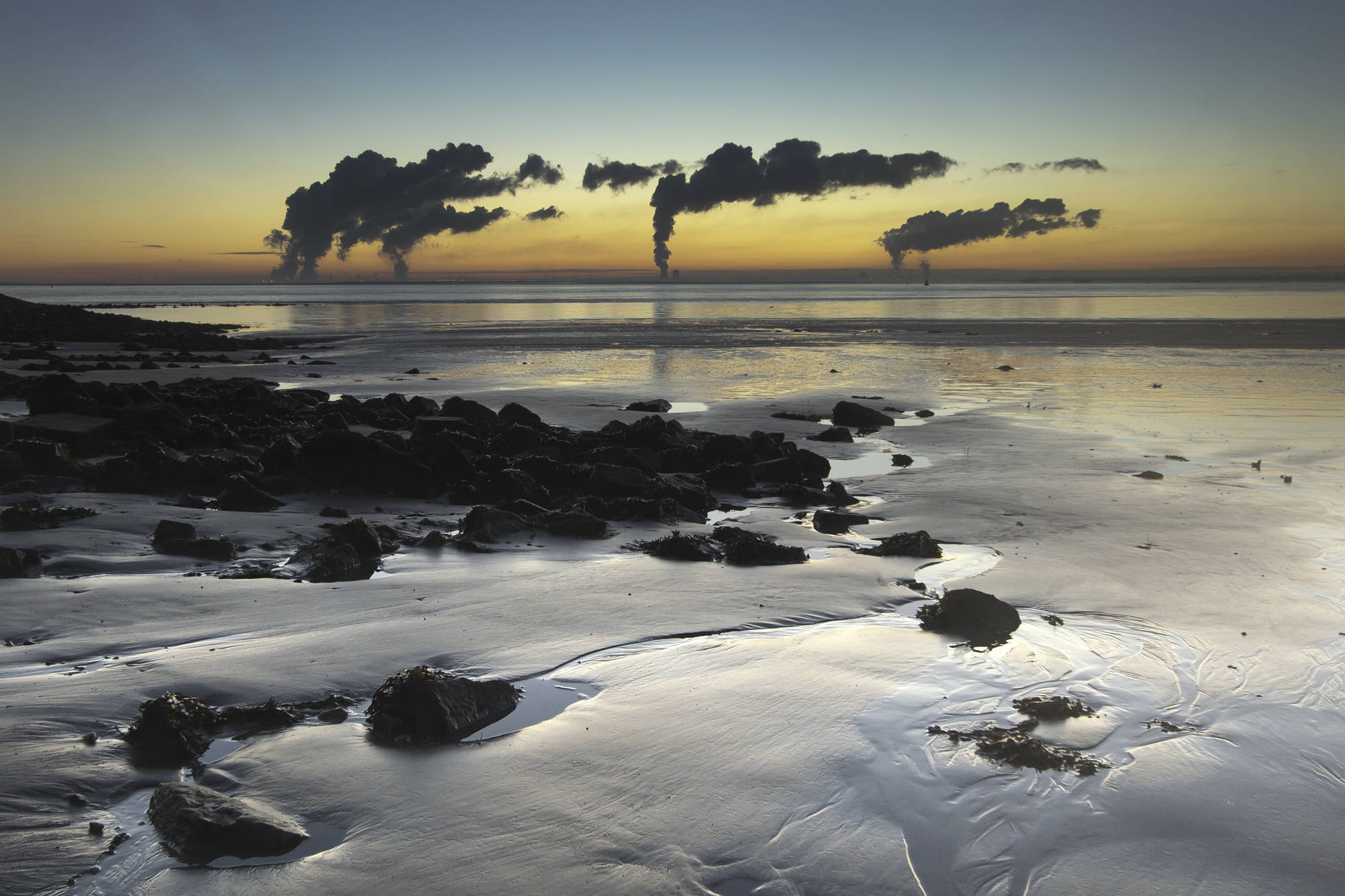 Westerscheldestrandje tijdens ochtendgloren met aan de overkant industrie.
