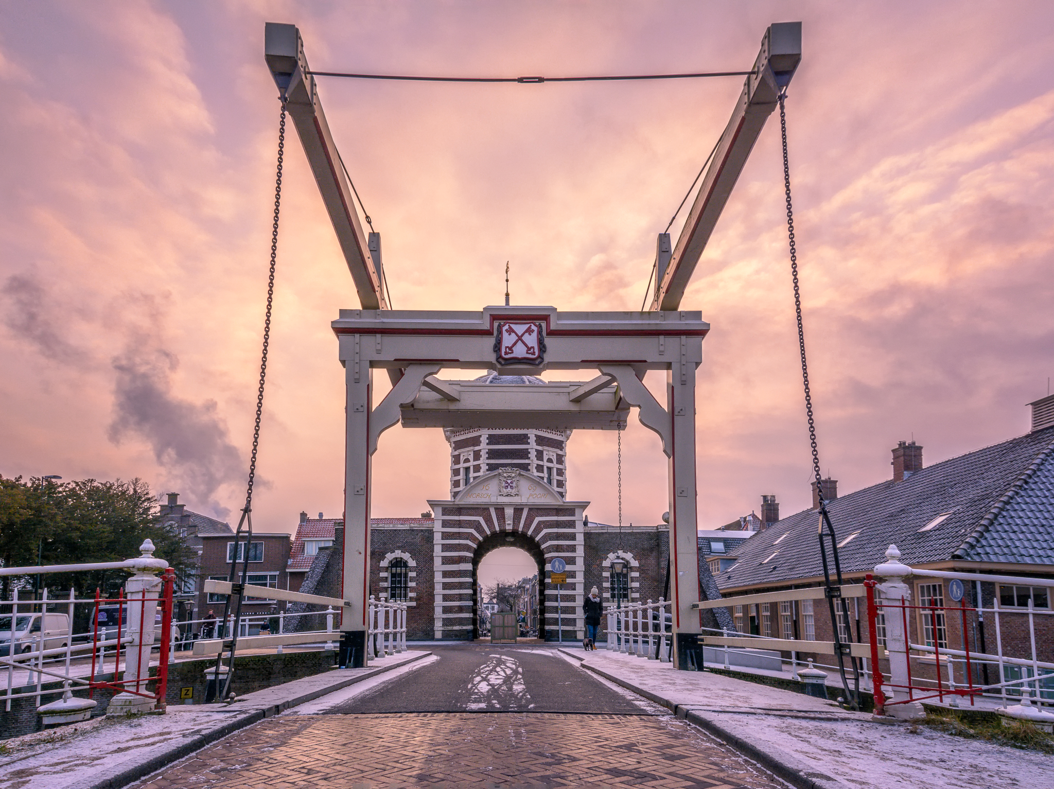 De monumentale Morspoort van Leiden vlak voordat de sneeuw losbarst...