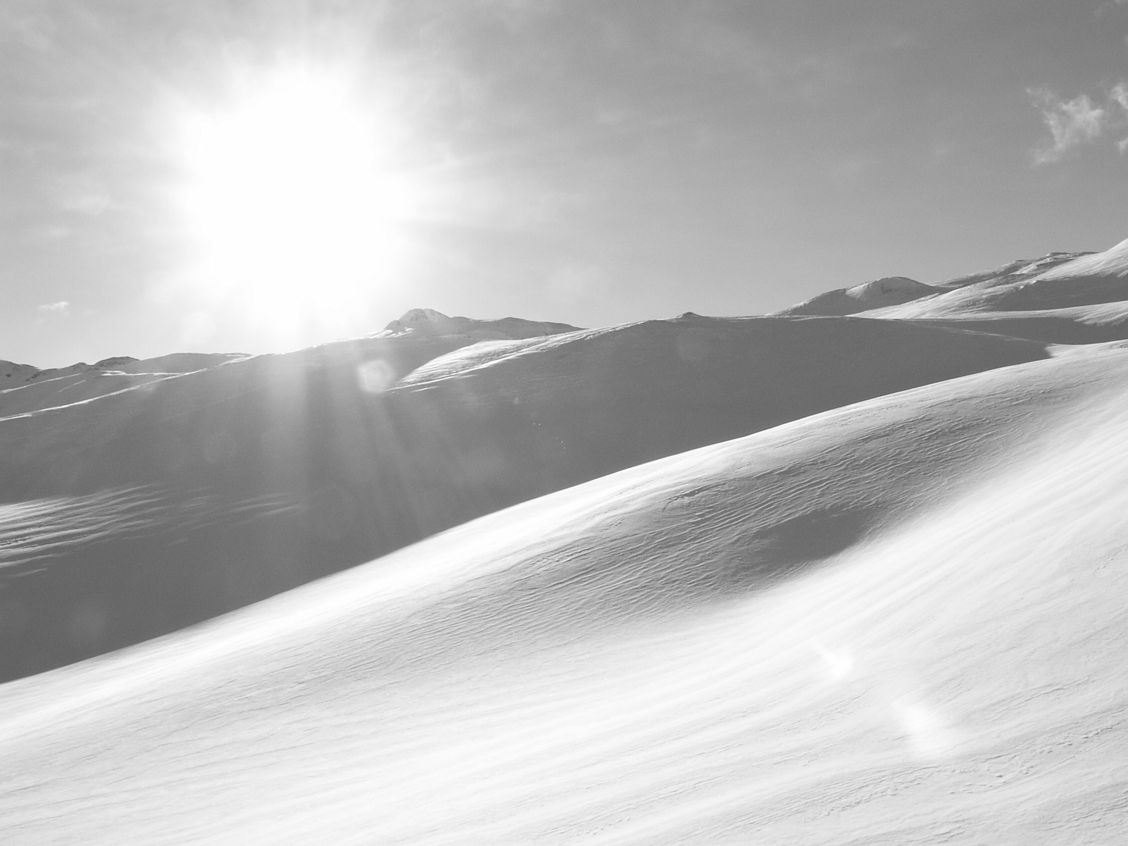 Foto van de laagstaande zon boven de besneeuwde bergen, vanuit de skilift in Tignes.