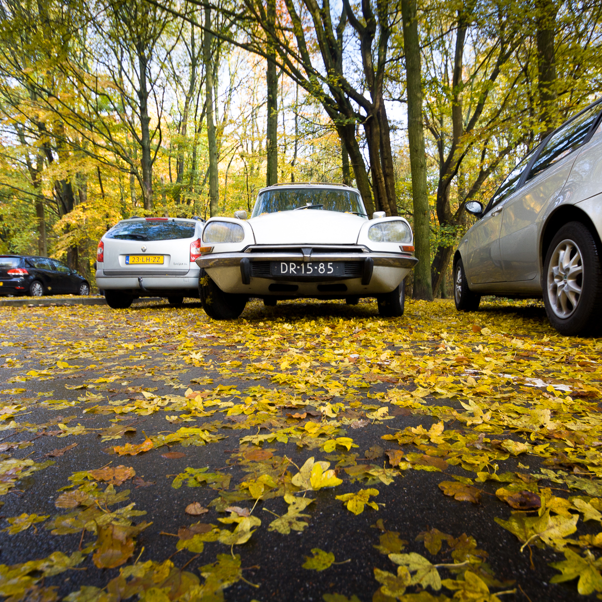 Mooie snoek op met bladeren bedekt asfalt in het Amsterdamse Bos