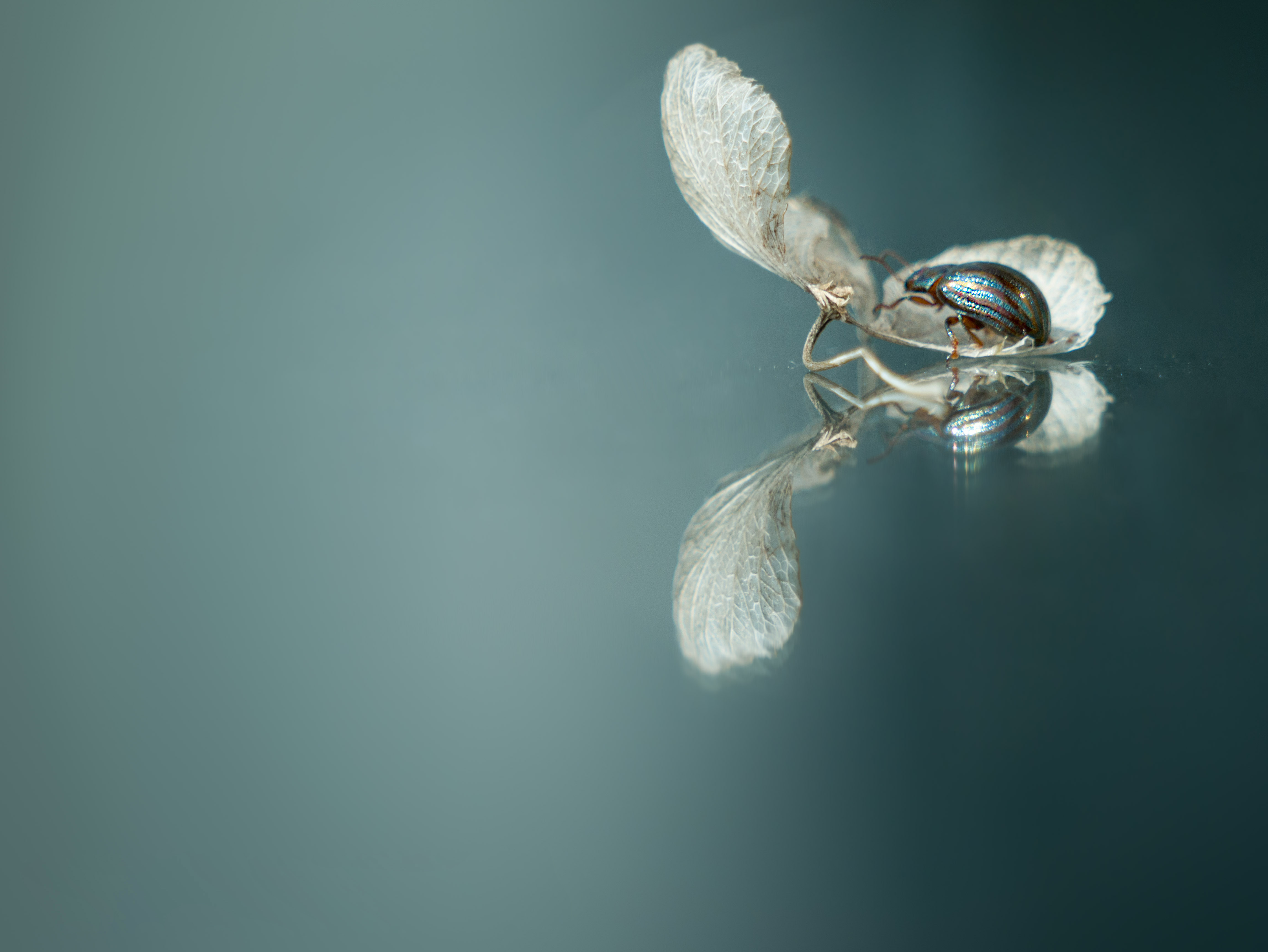 een verdord bloemetje en een torretje met prachtige kleuren, geschoten op een glazen tafel in de buitenlucht hetgeen zorgt voor de reflectie. Een bijna magisch tafereel, met alledaagse dingetjes.