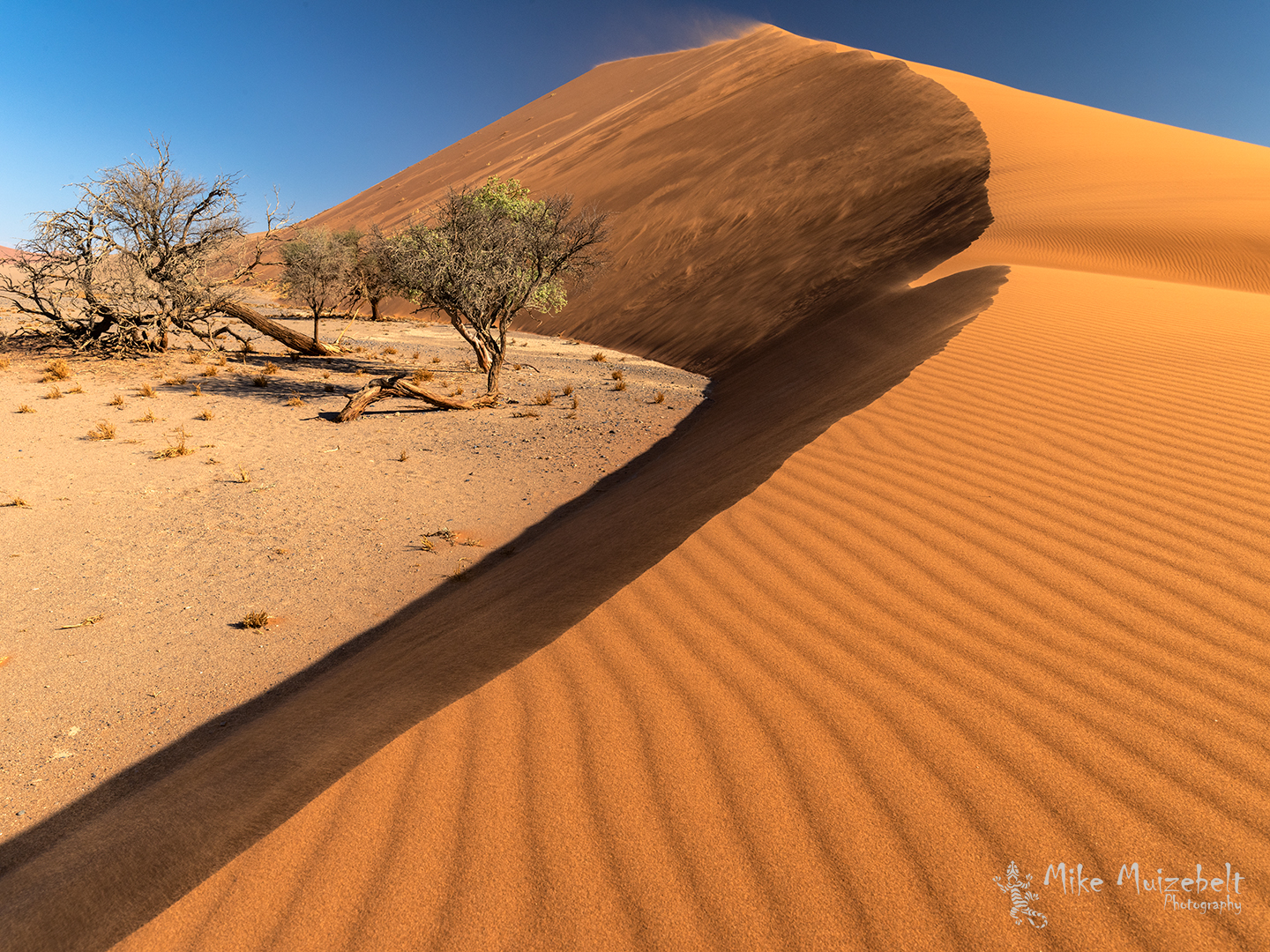 De dynamiek van de wind zorgt er voor dat de duinen in Sossusvlei langzaam opschuiven en als het ware door het landschap wandelen. Nu gaat dat erg langzaam, maar toch zullen deze bomen eens ten prooi vallen aan deze duin.