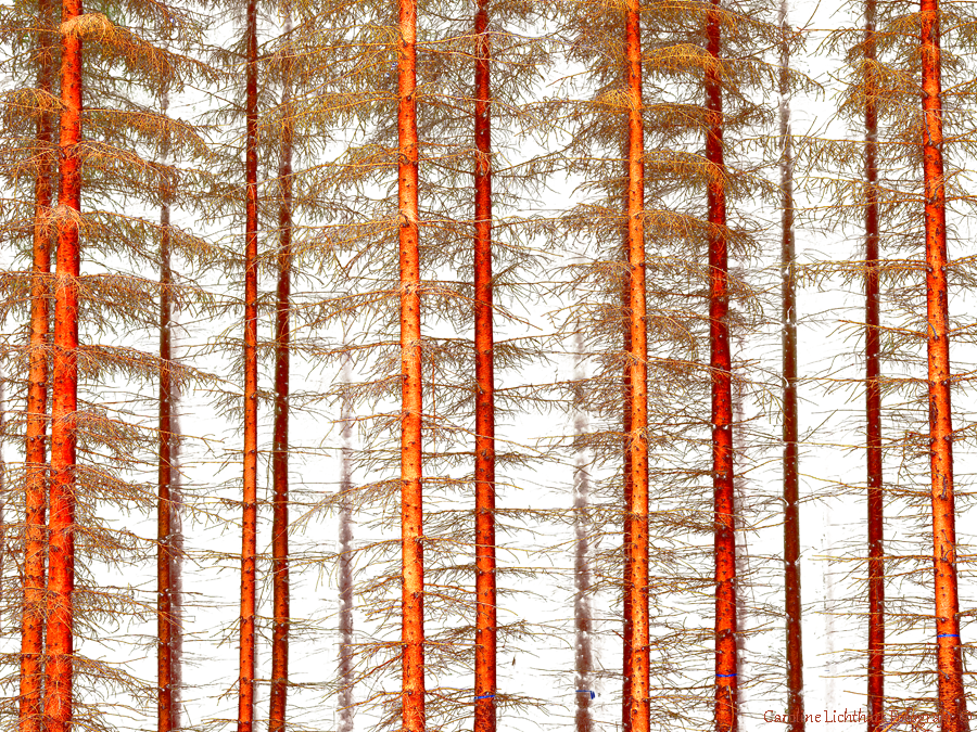 Stammen van sparren tegen een lichte achtergrond.