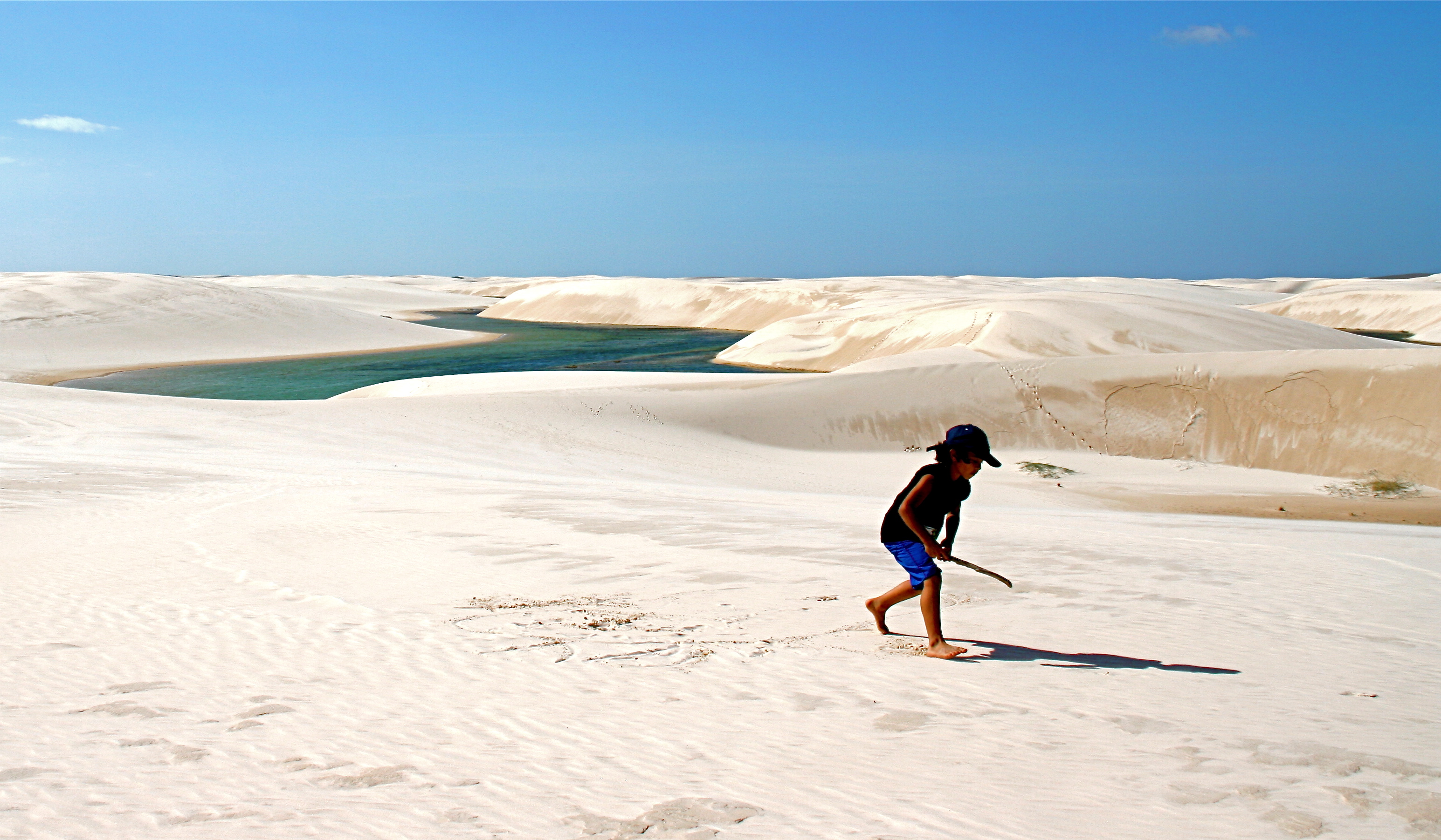 Spelen in de duinen van Lencois de Maranhenses in het noordoosten van Brazilië. Dit prachtige landschap is in onze zomer gevuld met regenwater.