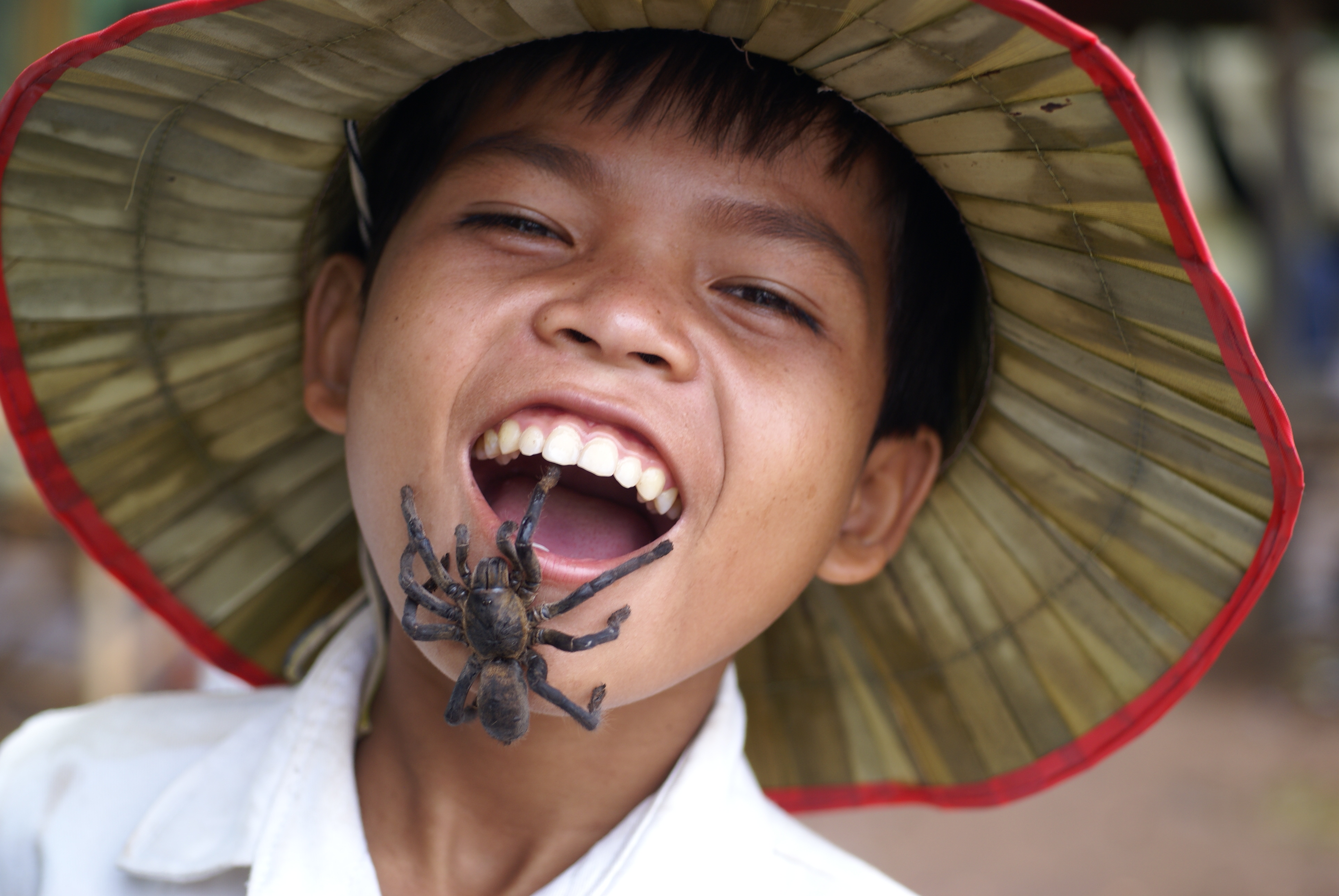 Deze jongen in Cambodjatoonde trots een vogelspin nadat zijn zusje een bordje geftituurde vogelspinnen presenteerde. Toen ik hem vroeg mij een levende te tonen spurte hij weg en kwam met deze terug en liet hem schaterend over zijn gezicht lopen.