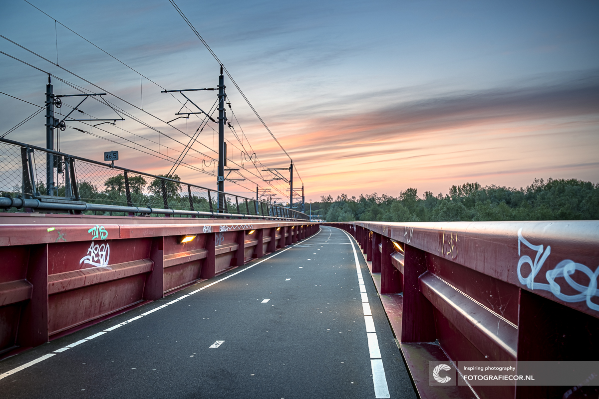 Een kenmerkende spoorweg overspanning over de rivier de IJssel nabij de hoofdstad Zwolle met een lengte van bijna 1km. Middels het voet en fietspad kan e de brug bewandelen en wie een beetje vroeg is in de ochtend kan getrakteerd worden op prachtige zonsopkomsten boven de uiterwaarden van de IJssel. Volg je de spoorbrug dan kan je er ook voor kiezen om iets te doen met de architectuur en de leidende lijnen van deze bijna onafzienbare rode brug :-)