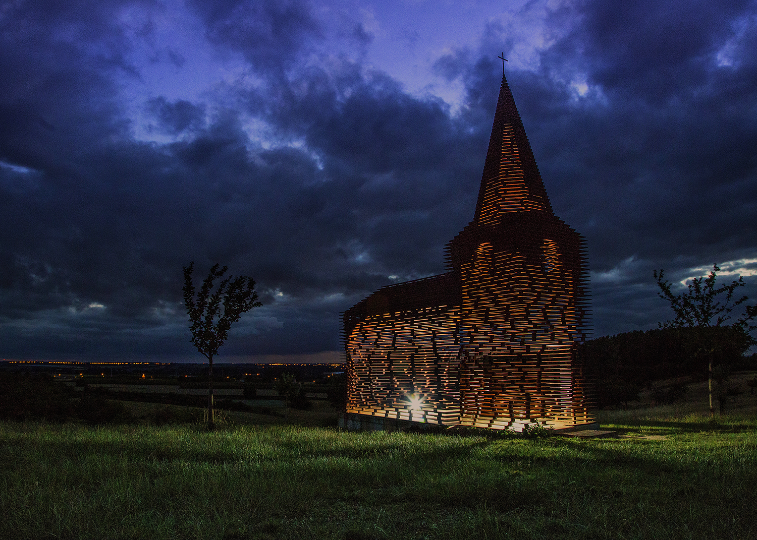 Doorkijkkerkje in Borgloon, van binnen verlicht met 2 flitsers om eens van binnen naar buiten het licht te laten vloeien