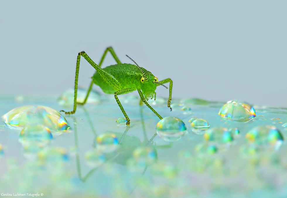 Een Struik-sprinkhaantje op een glad beregend oppervlak.