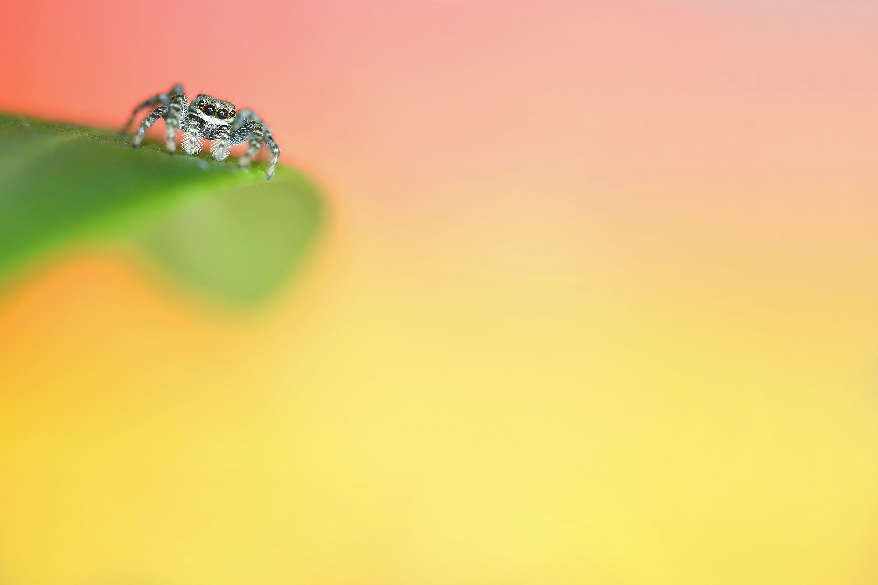 Zo klein als ze zijn en zo goed als ze kunnen springen. Hier het springspinnetje ruim gekaderd zodat de achtergrondkleuren mooi mee doen. Springspinnetje kijkt bijna angstig alsof hij hoogtevrees heeft!
