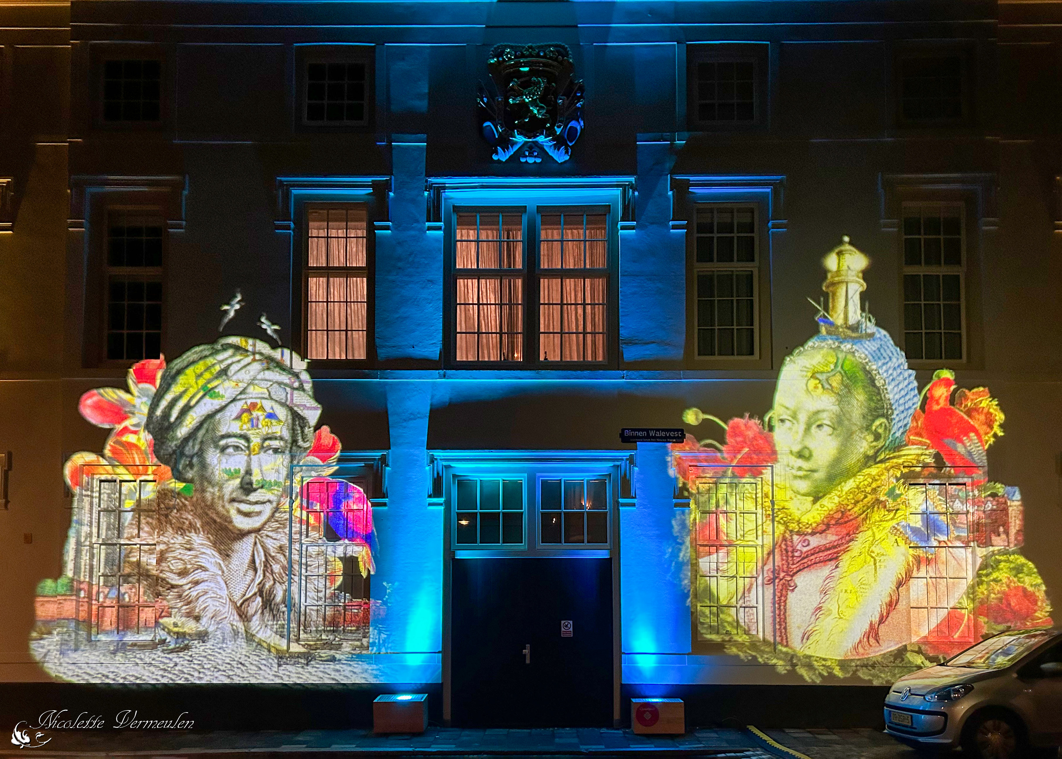 Tijdens de avondwandeling Dwaalspoor is de stad verlicht in allerlei kleuren.