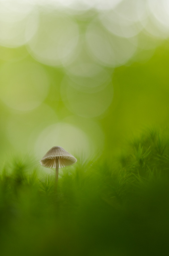 Vaak zie je paddestoelen groot in beeld, ik wilde op zoek naar een boeiend beeld waarbij de paddestoel klein in beeld zou komen te staan.