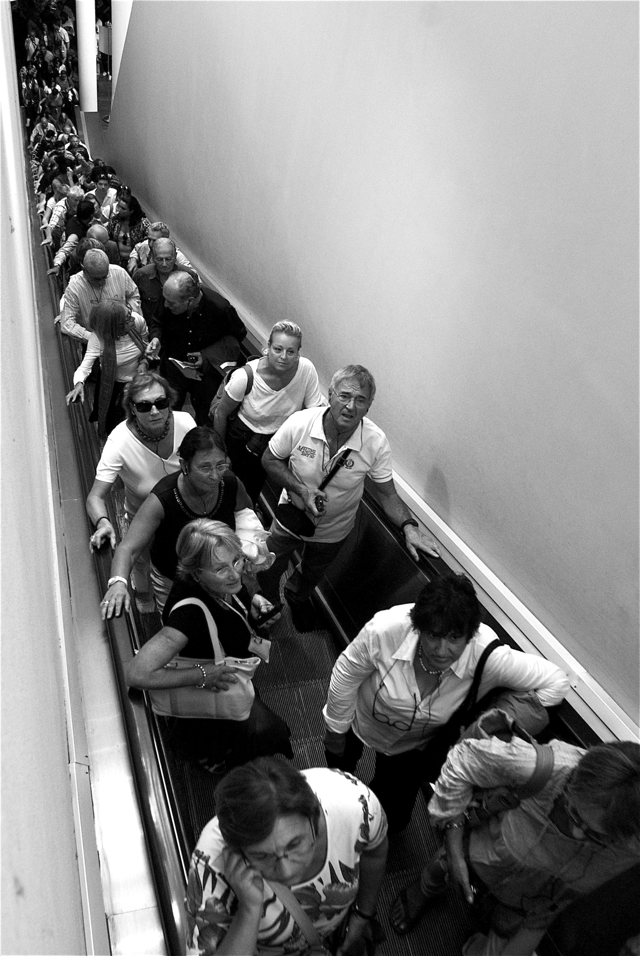 Deze mensen hebben urenlang in een lange rij voor het Vaticaan museum staan te wachten voor ze langs de duane konden om het museum te betreden . Daar echter wachtte hen nog een rij en dat was die van de lange roltrap het eigenlijke museum in. Eindelijk.