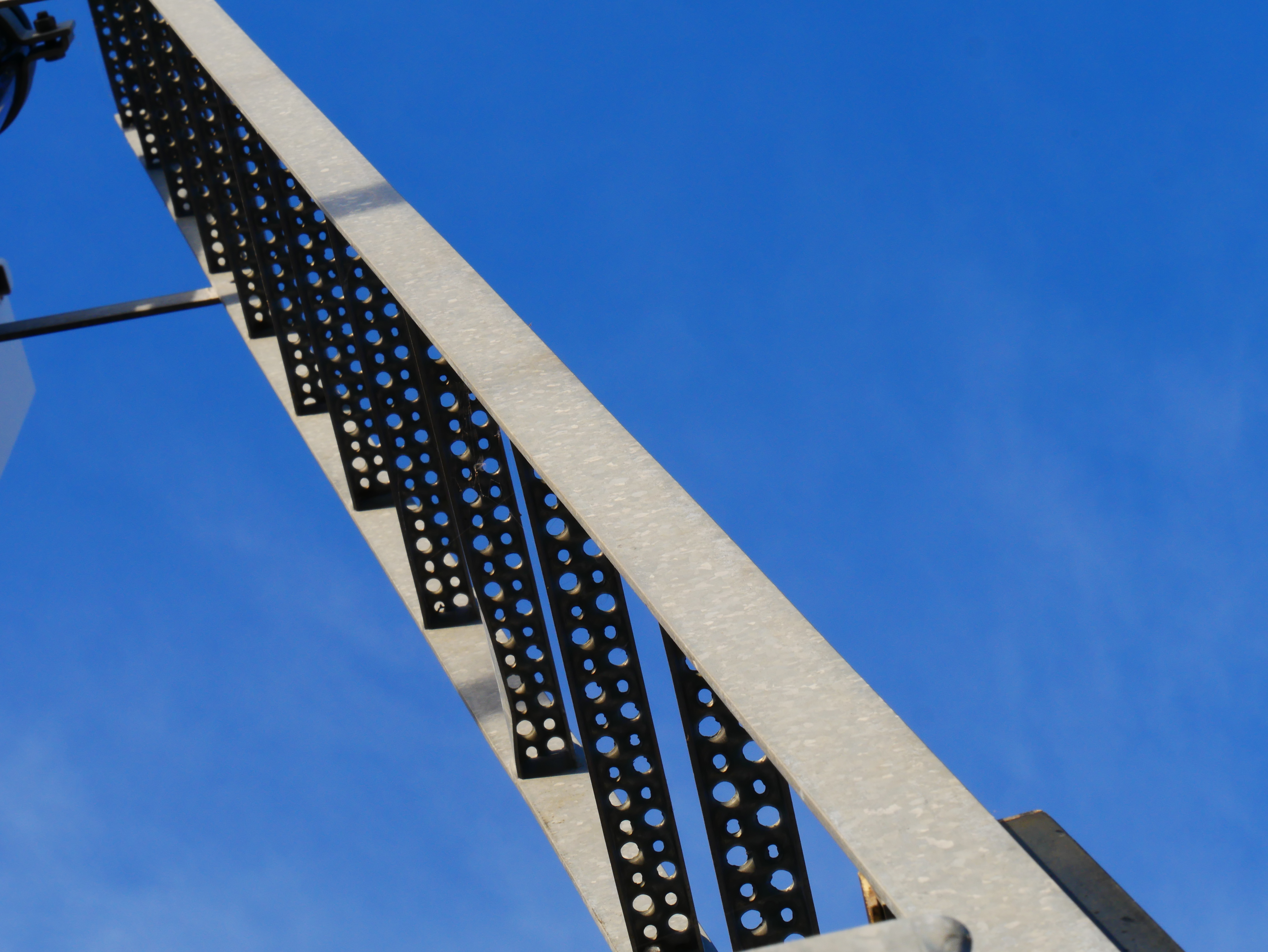 Deze trap leidt naar een seinkastje bij een treinstation. Ik vond dit metaal mooi afsteken tegen de blauwe lucht.