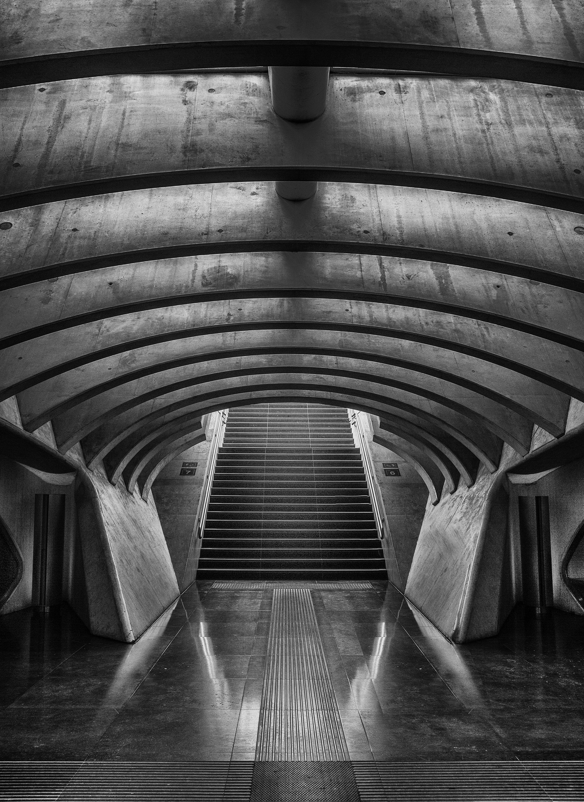Donkere zwart-wit opname van de corridor om onder het station Luik Guillemins naar boven te gaan, op het juiste moment dat het licht tussen de betonnen structuren valt.