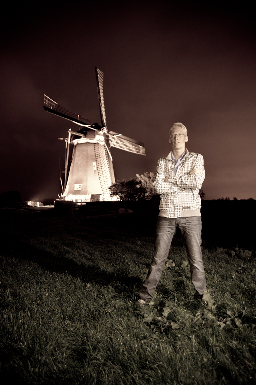 's nachts gemaakt tijdens de verlichte molens, verschillende losse flitsers zorgden er hier voor dat de persoon goed verlicht werd