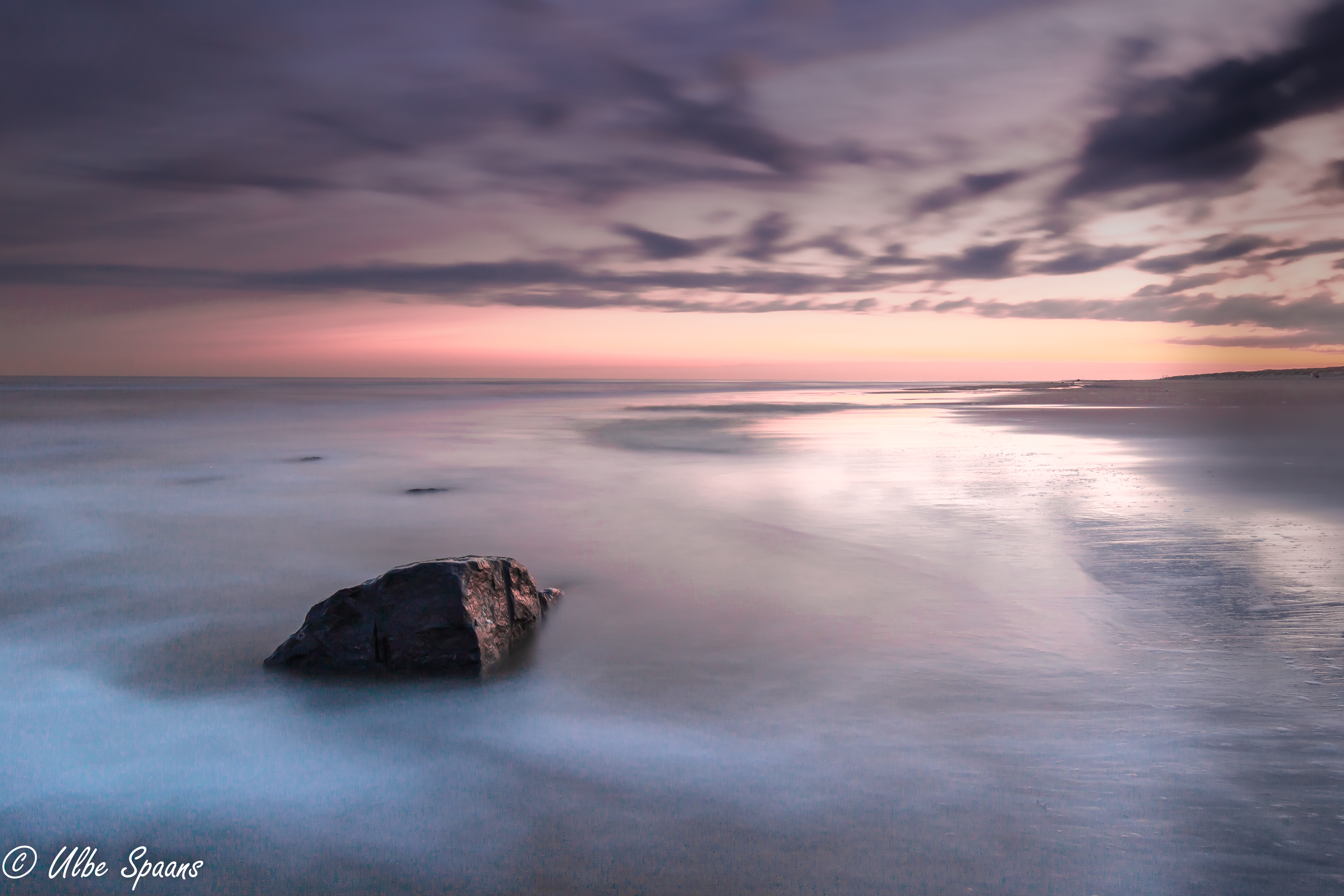 Onder een dramatische en kleurrijke lucht is een steen in de spiegelgladde zee te zien.