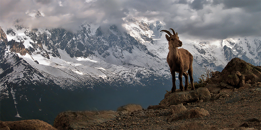 Vrouwtjes steenbok poseert voor de Mont-Blanc