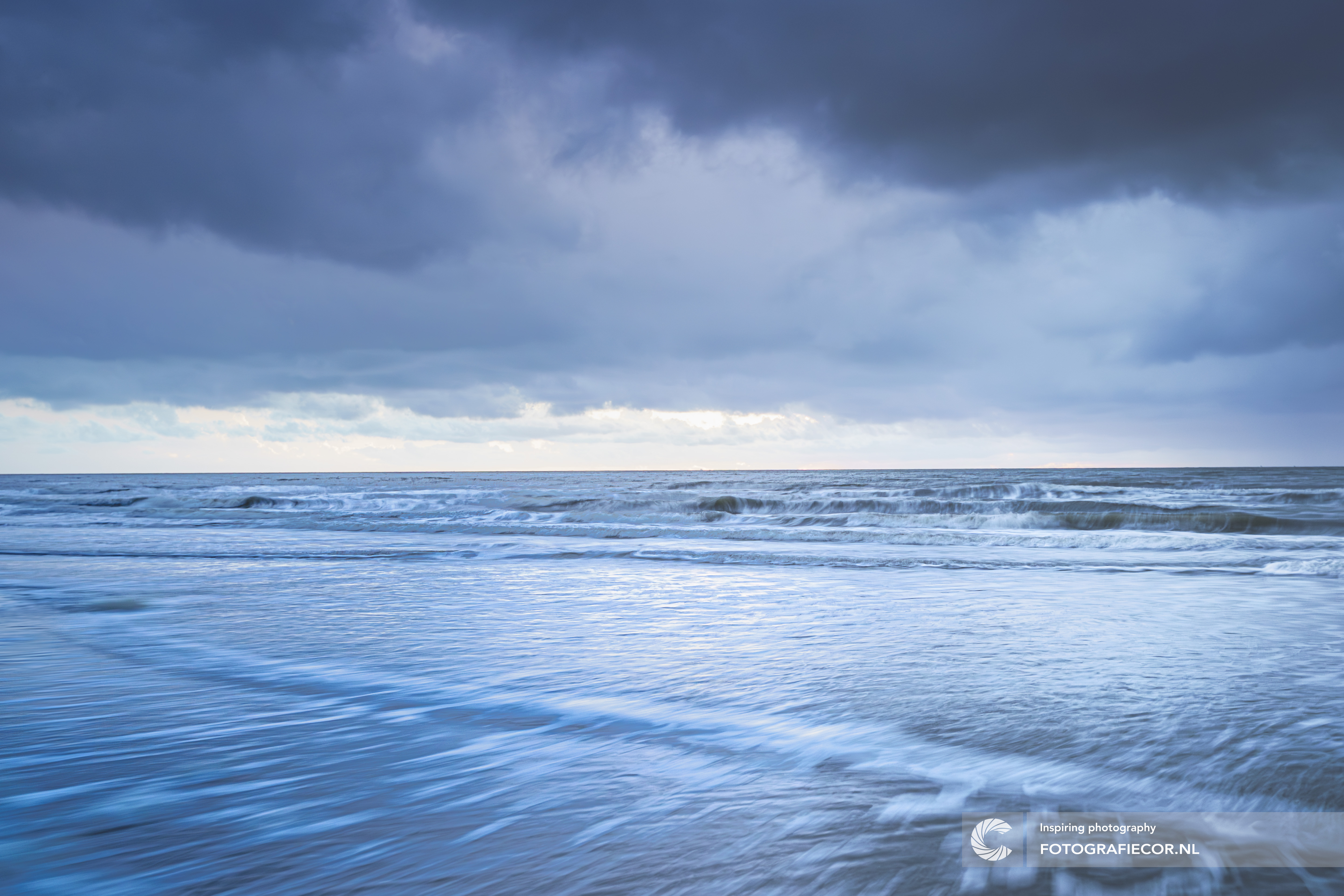De dynamiek van de Nederlandse kust op het waddeneiland Texel. Donkere wolken die overdrijven en golven die beuken op het strand terijl je eindeloos ver weg kan kijken tot aan het einde van de horizon.