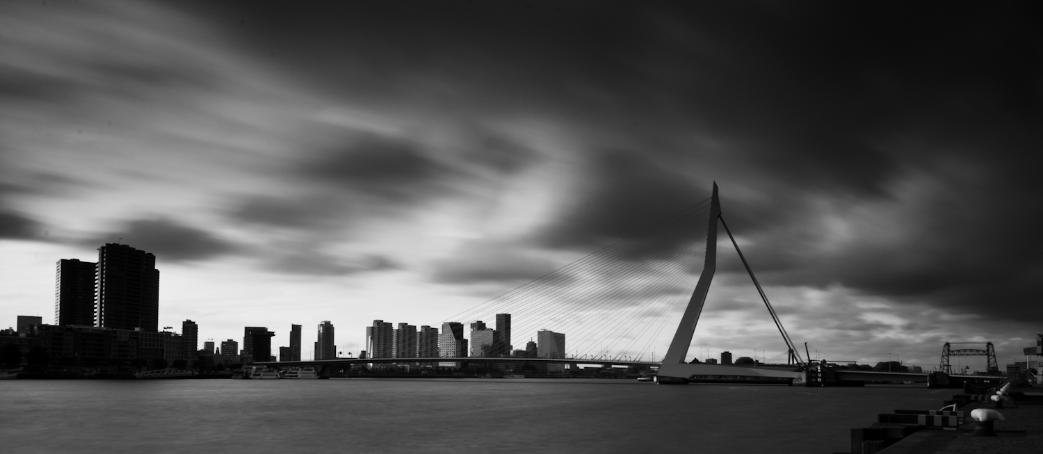 Deze foto is gemaakt vanaf de Kop van Zuid in Rotterdam. Boven de Erasmusbrug handen stormachtige wolken.