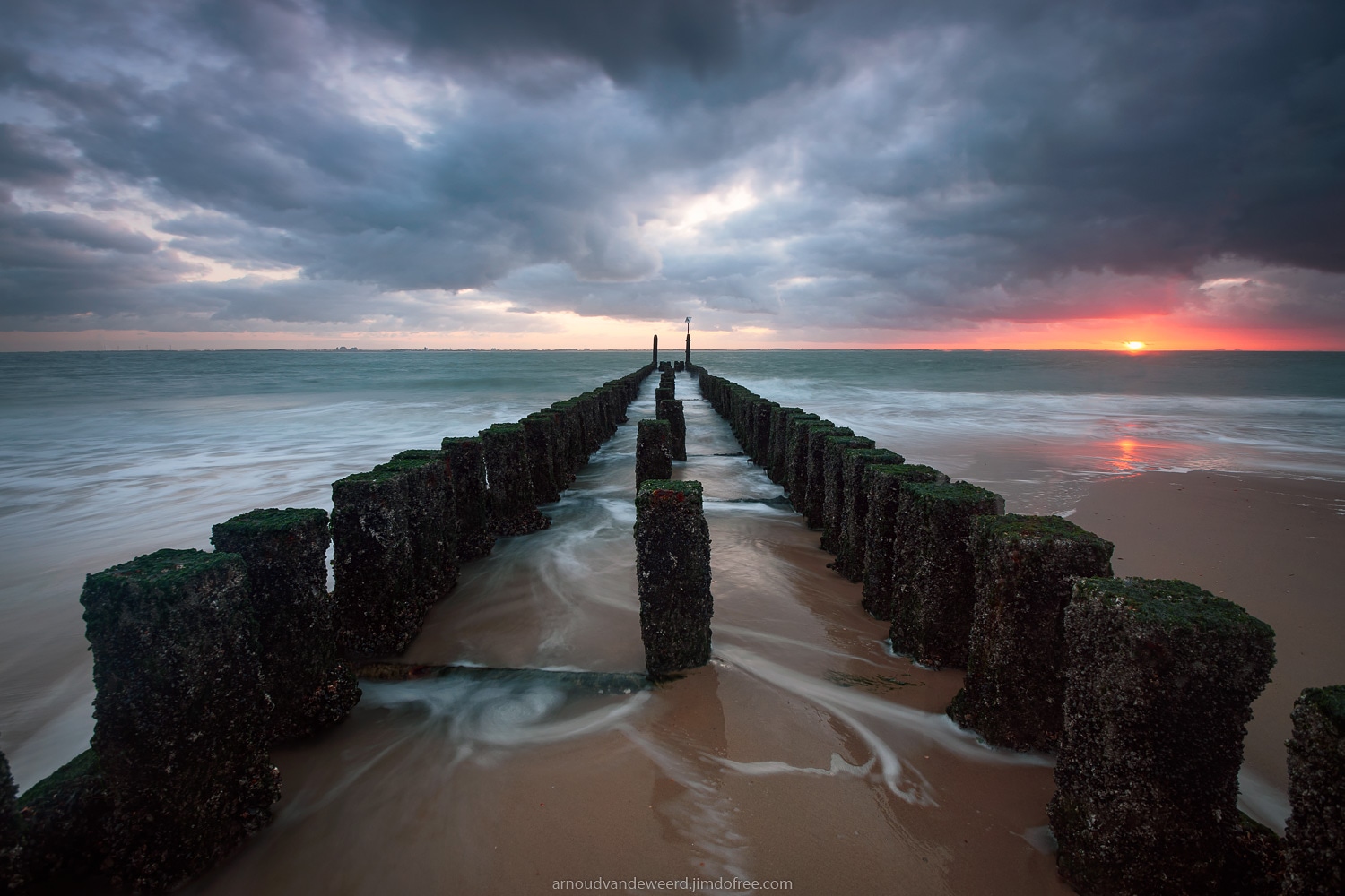 Mooie, stormachtige omstandigheden op een strand bij Vlissingen tijdens zonsondergang.