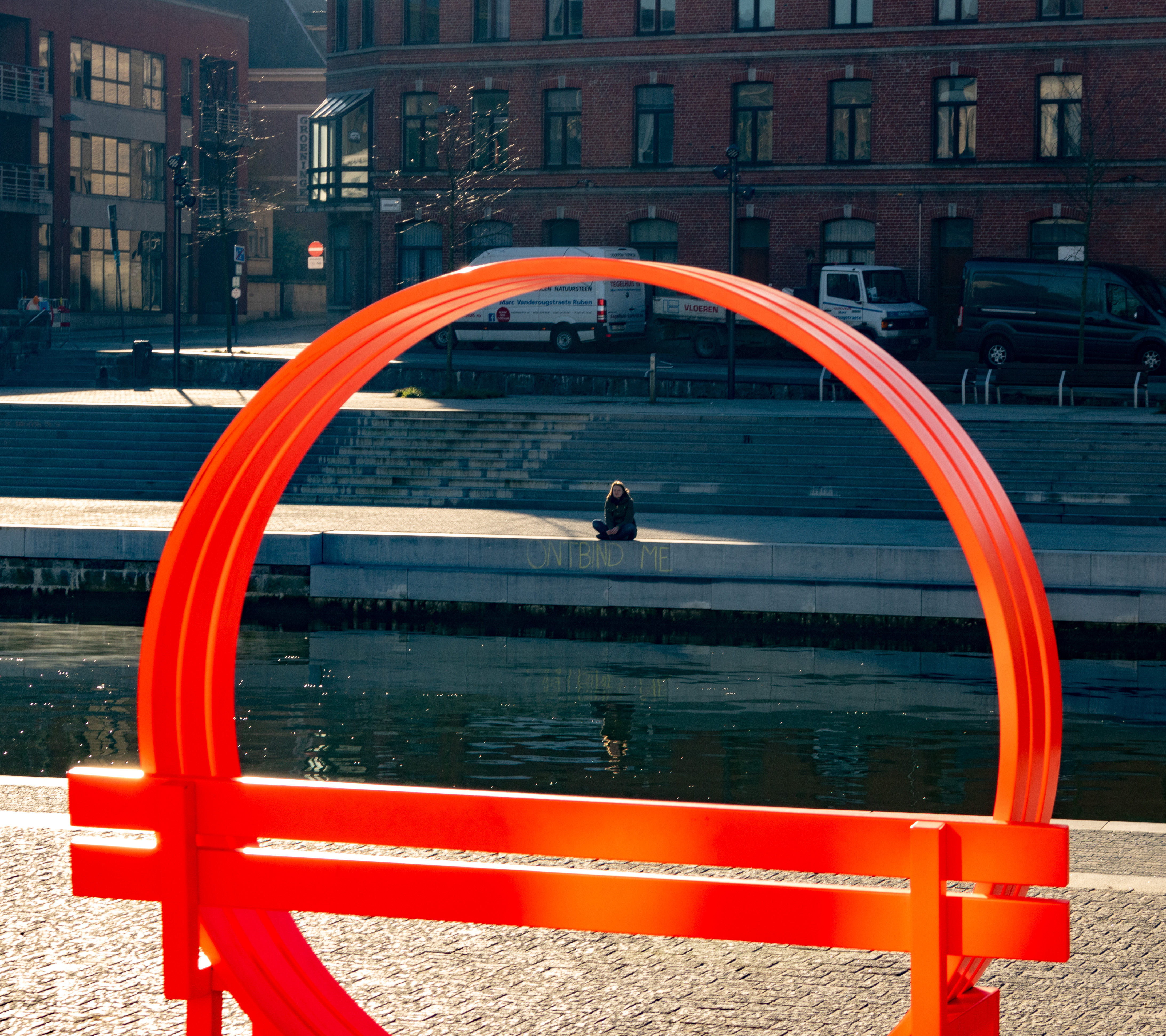 Opgemerkt in Kortrijk, met het opschrift in krijt op de arduinen rand: " Ontbind Me "