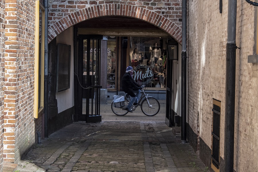Muts- en dasdragende man fietst langs winkel 'Muts'.