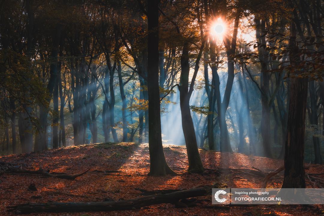 Nacht uit, spot aan en laat de dag maar beginnen. Alsof er een spot uit de hemel door het bos heen priemt. Een heldere koude nacht, gevolgd door heldere zonsopkomst geeft de grootste kans op mist.