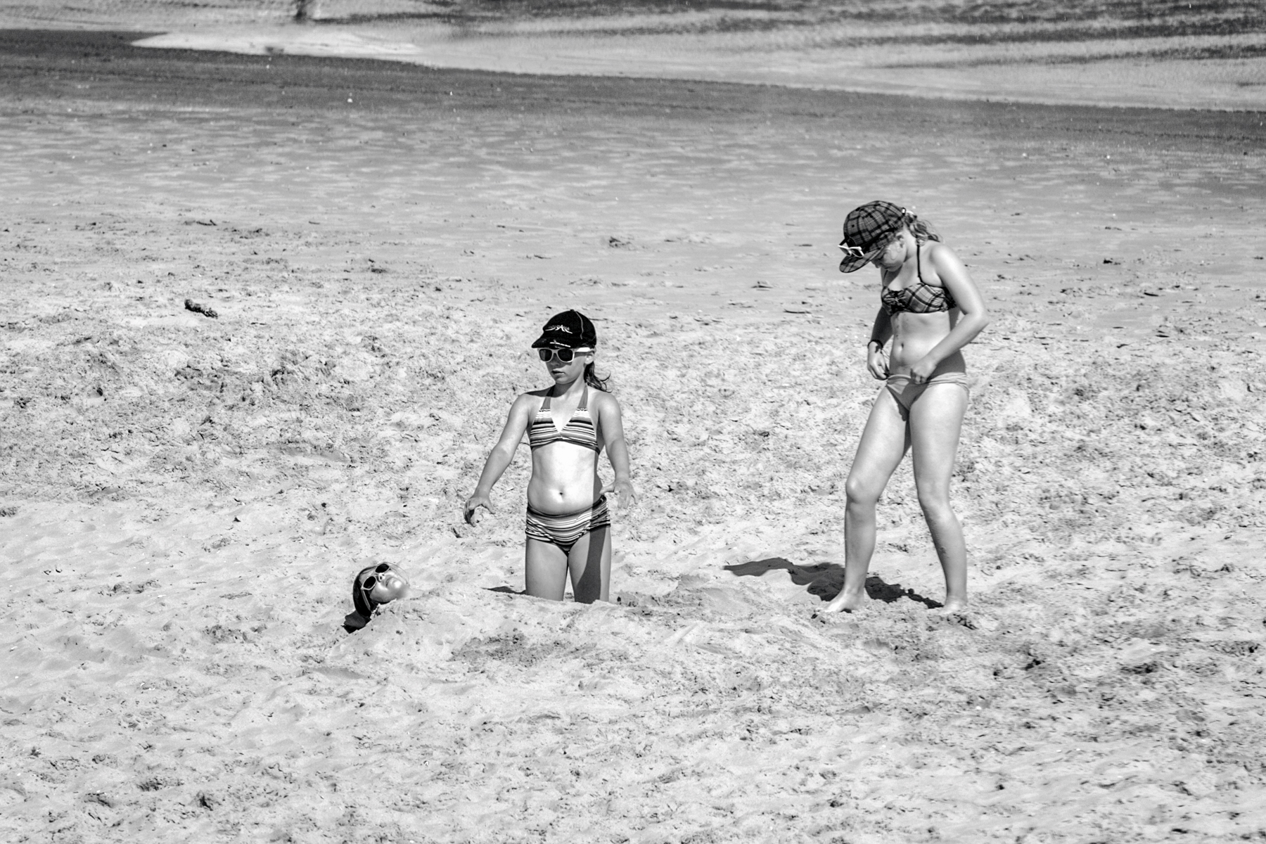 Jonge meiden samen aan het spelen op het strand in Ameland. De ongemakkelijkheid met het lichaam straalde er vanaf. Het was een uitdaging dit weer te geven.