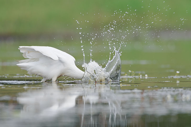 Deze kleine zilverreiger fotografeerde ik vanuit mijn drijvende schuilhut. Dit moment wou ik fotograferen, maar toch was het nog eerder een toevalstreffer omdat dit zo razendsnel gaat dat het gokken was om op het juiste moment af te drukken. Toen hij terug met zijn hoofd boven water kwam, had hij een visje vast.